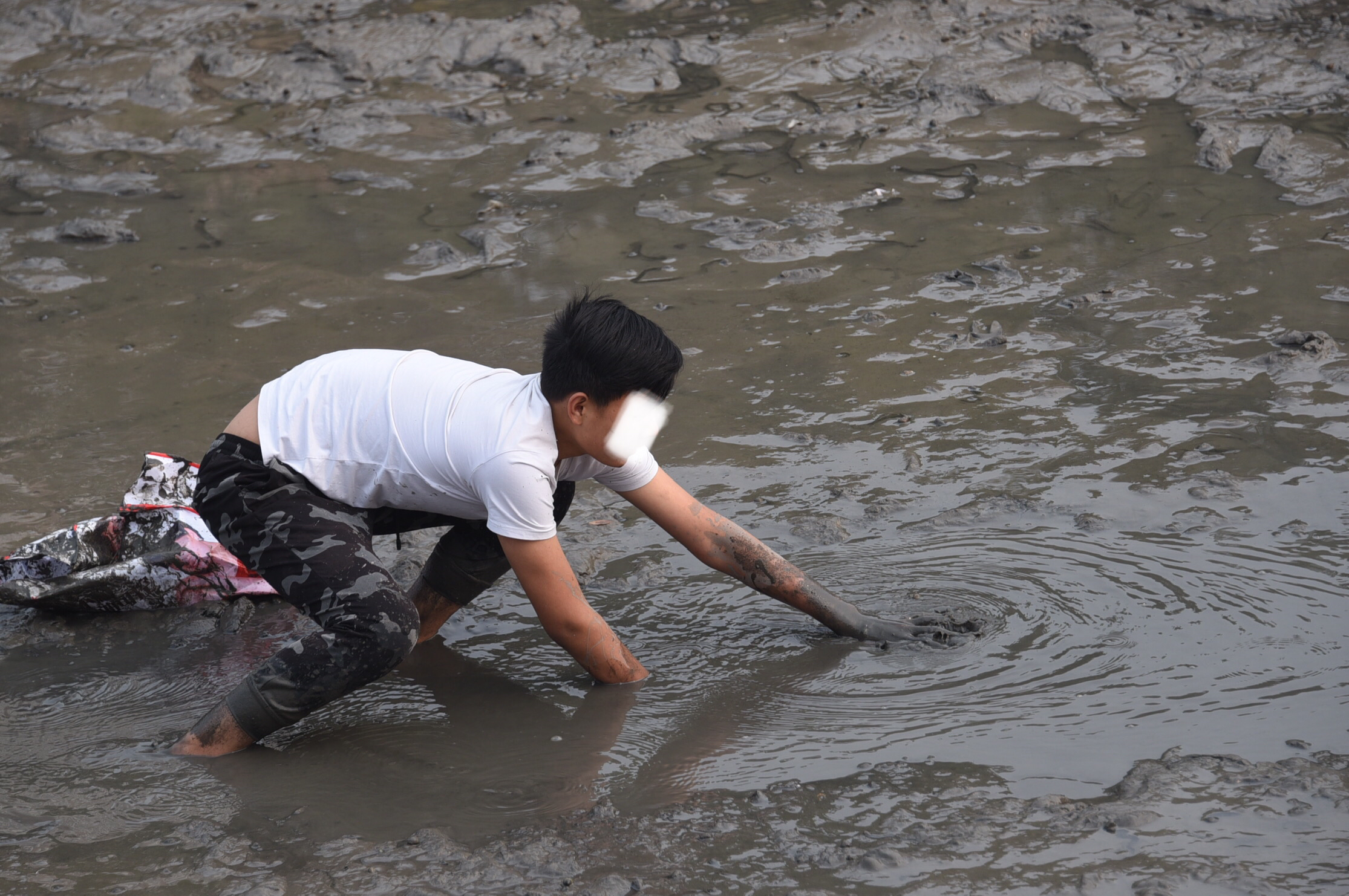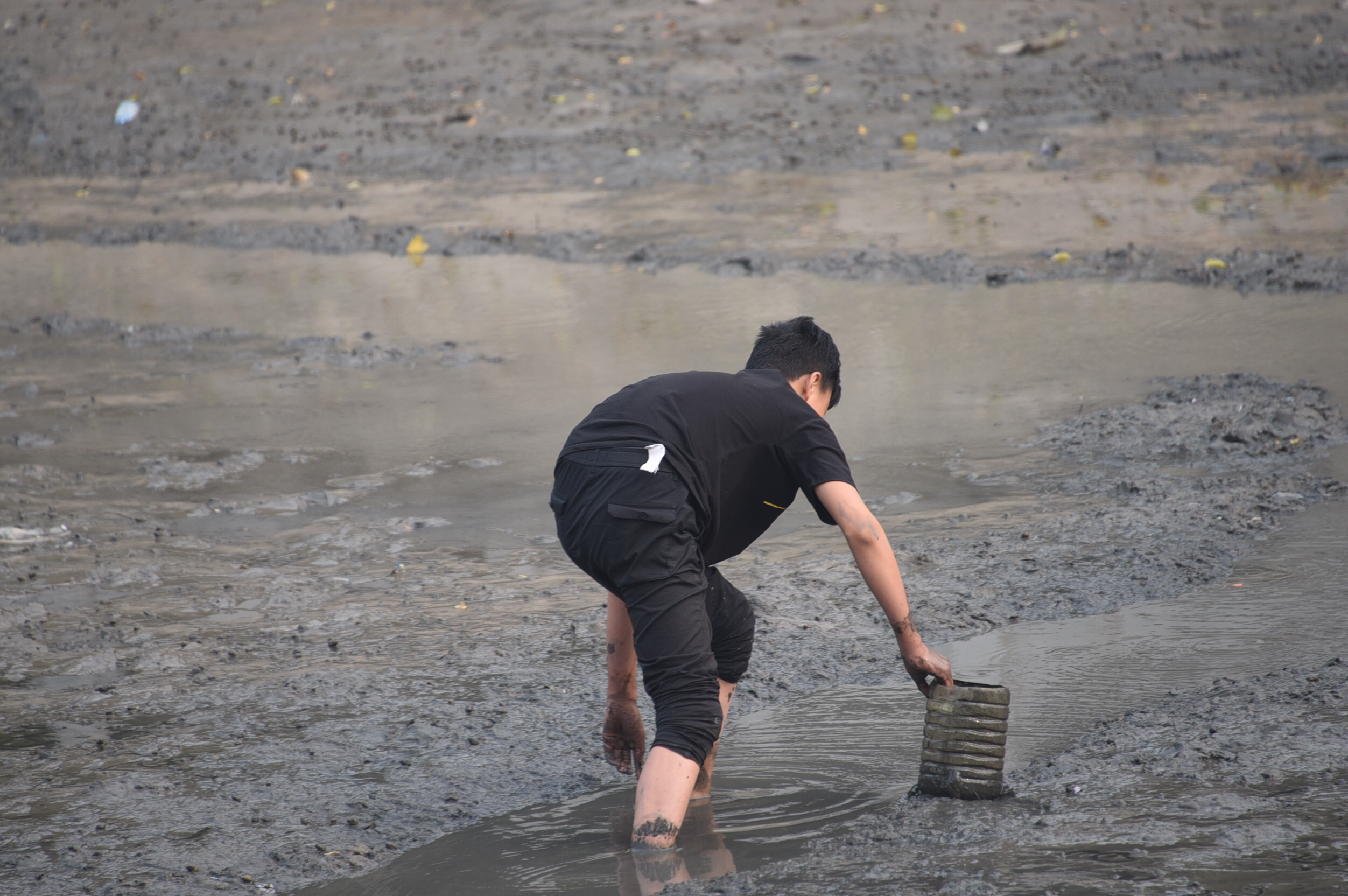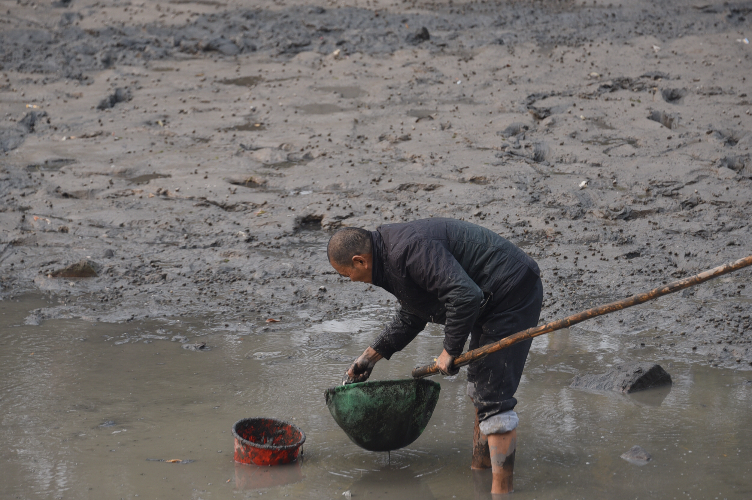 河底的淤泥很深,捕鱼者下去后,有的被淤泥没过膝盖,但他们并不害怕,反而乐在其中。淤泥上,散落着密密麻麻的的螺蛳,却没有人捡拾。捕捞的小鱼大部分活着,多为小鲫鱼。