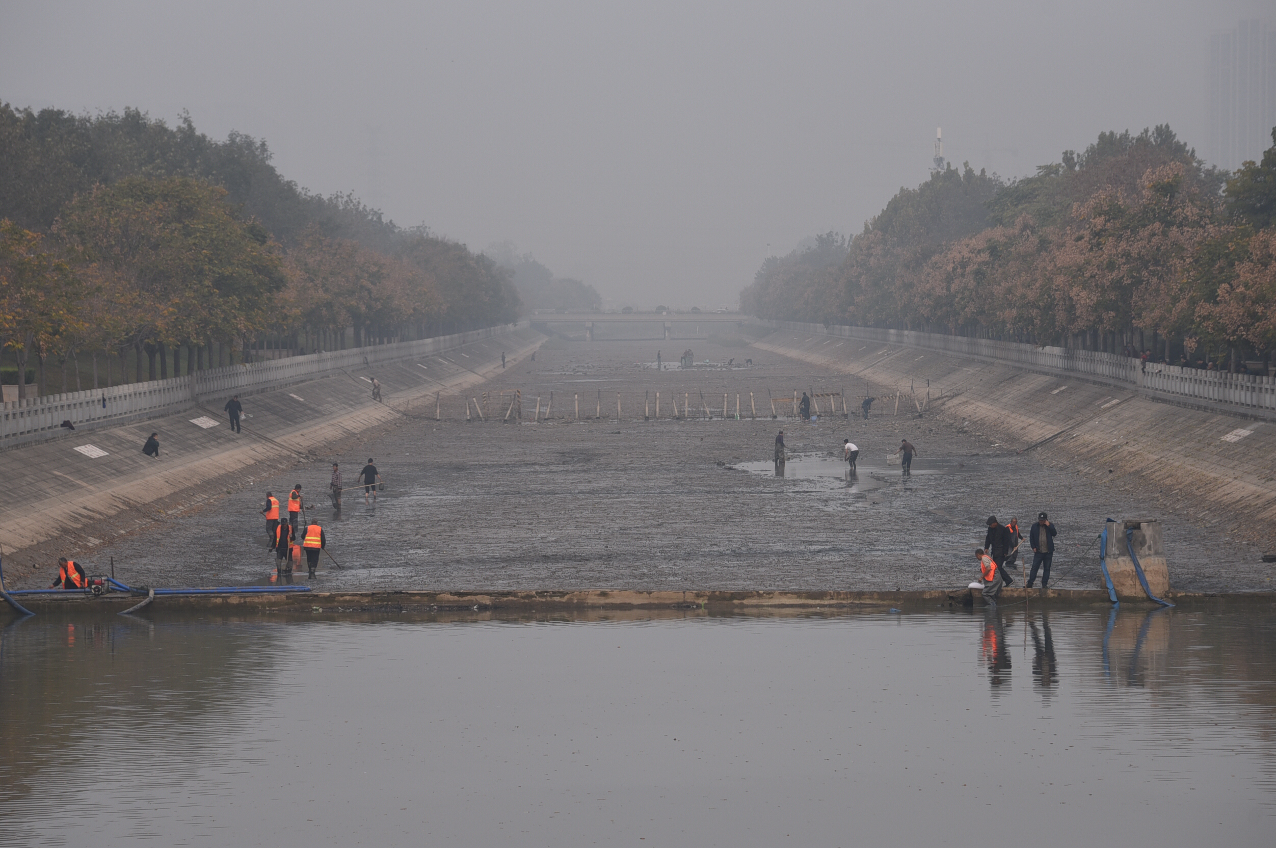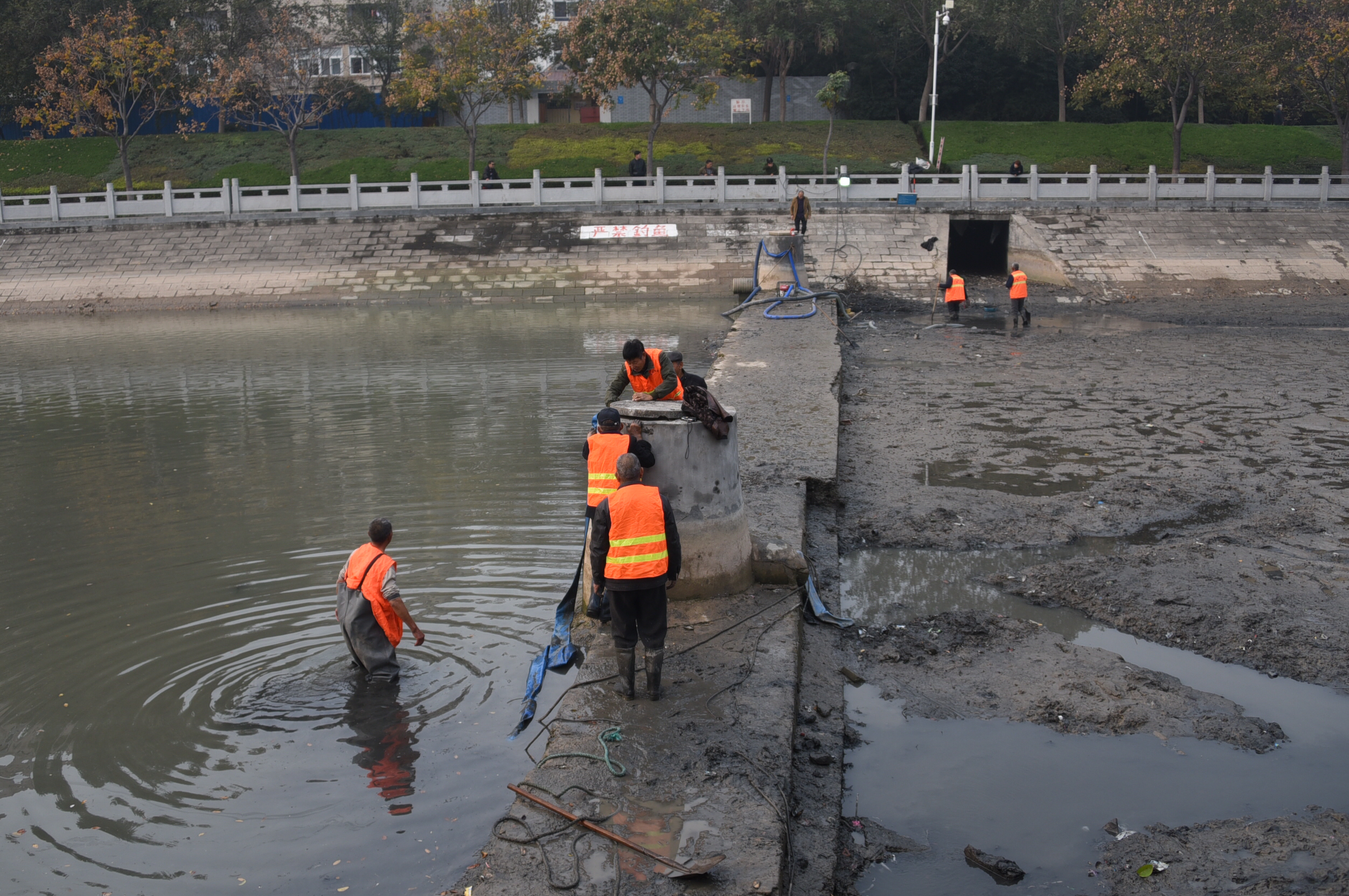 郑州东风渠抽水清淤 市民“浑水摸鱼”