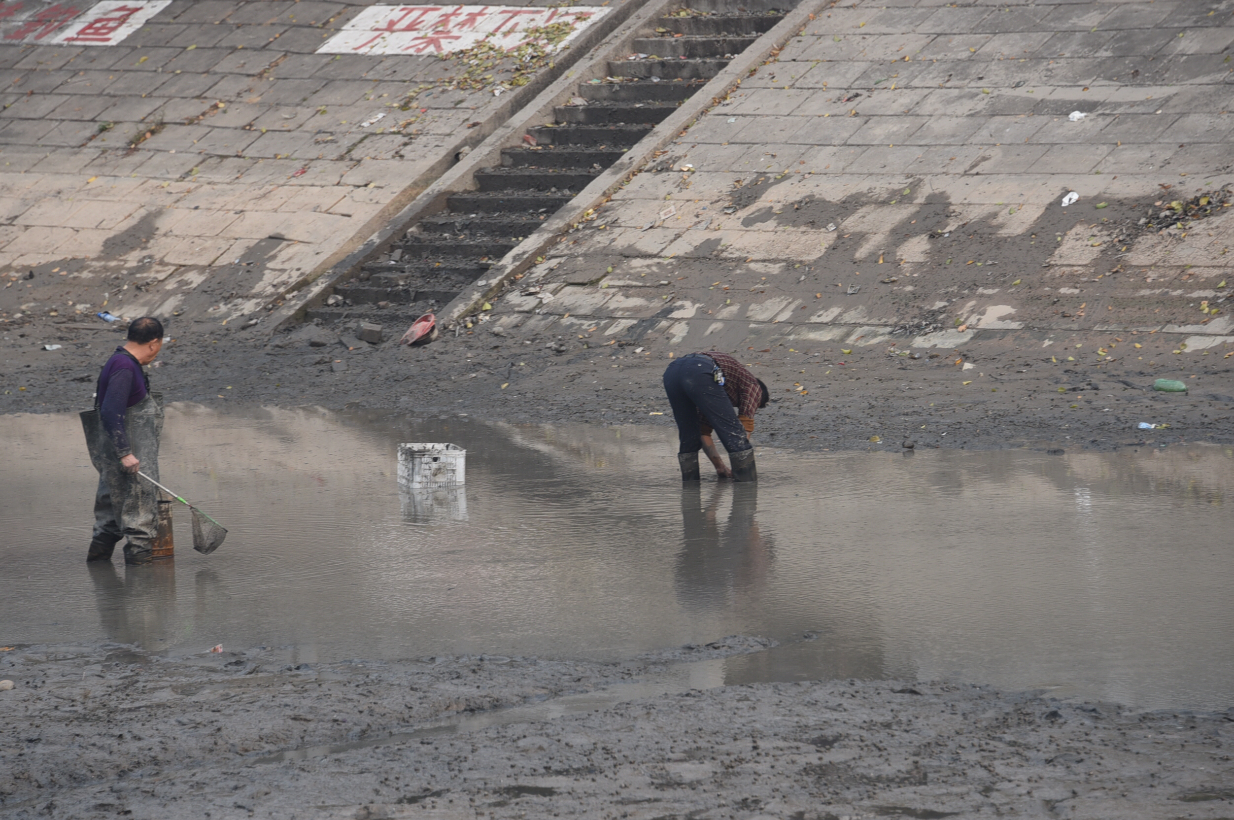 11月7日下午2点,在此处约300米长的渠段内,有20多人在捕鱼,其中大多是中年人,也有年轻人参与。他们有的用抄网,有的用菜筐捞,有的干脆徒手抓,忙的不亦乐乎,岸边一台抽水泵在轰鸣着抽水,几名工人挖出几条水沟,让水顺沟流到坝下,使这一段渠中的水越来越少。当露出水底的淤泥后,那些原先生活在渠里的鱼虾再无处藏身,开始在泥糊里跳跃,捕鱼人发现后,立即上前将它们一一抓走。