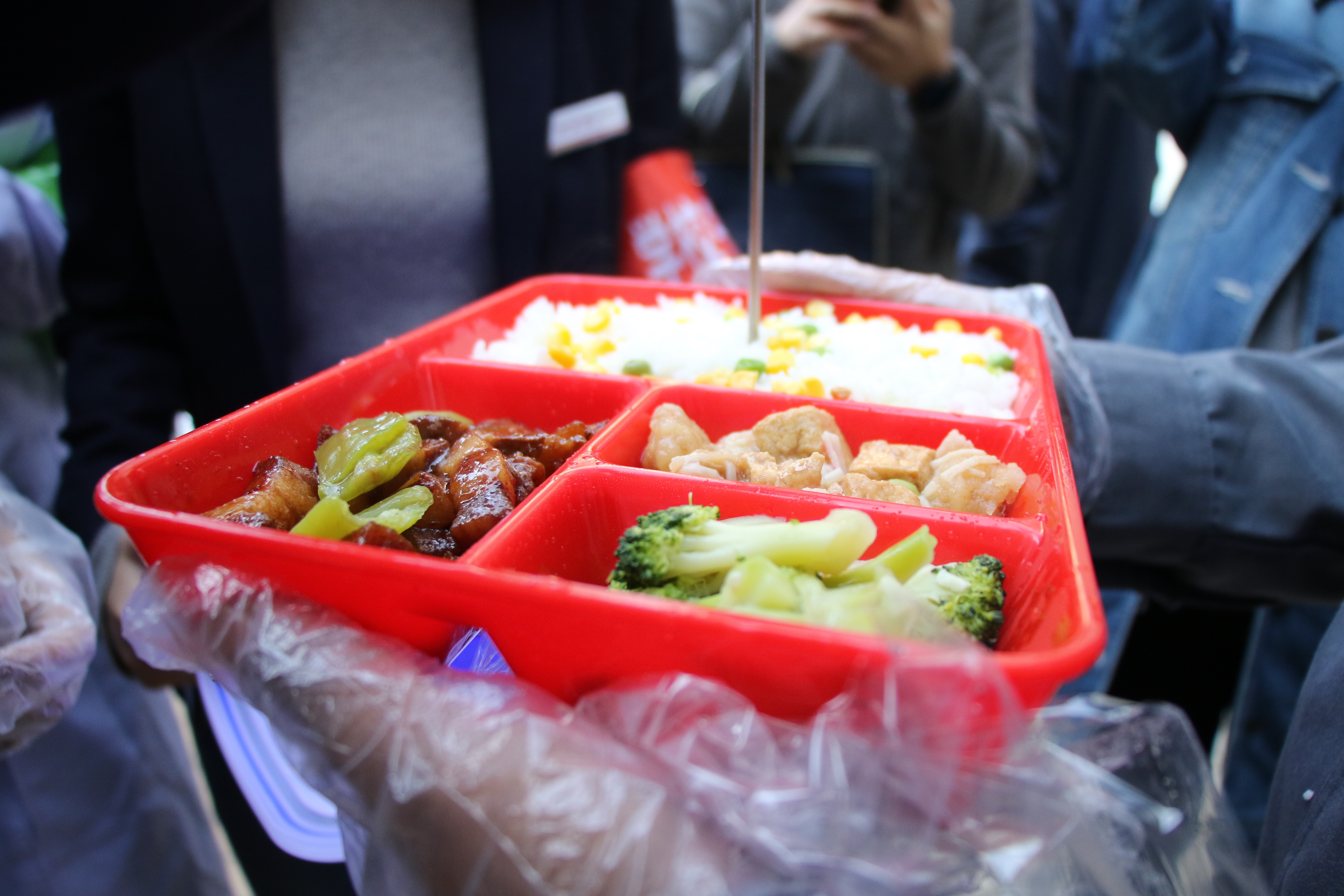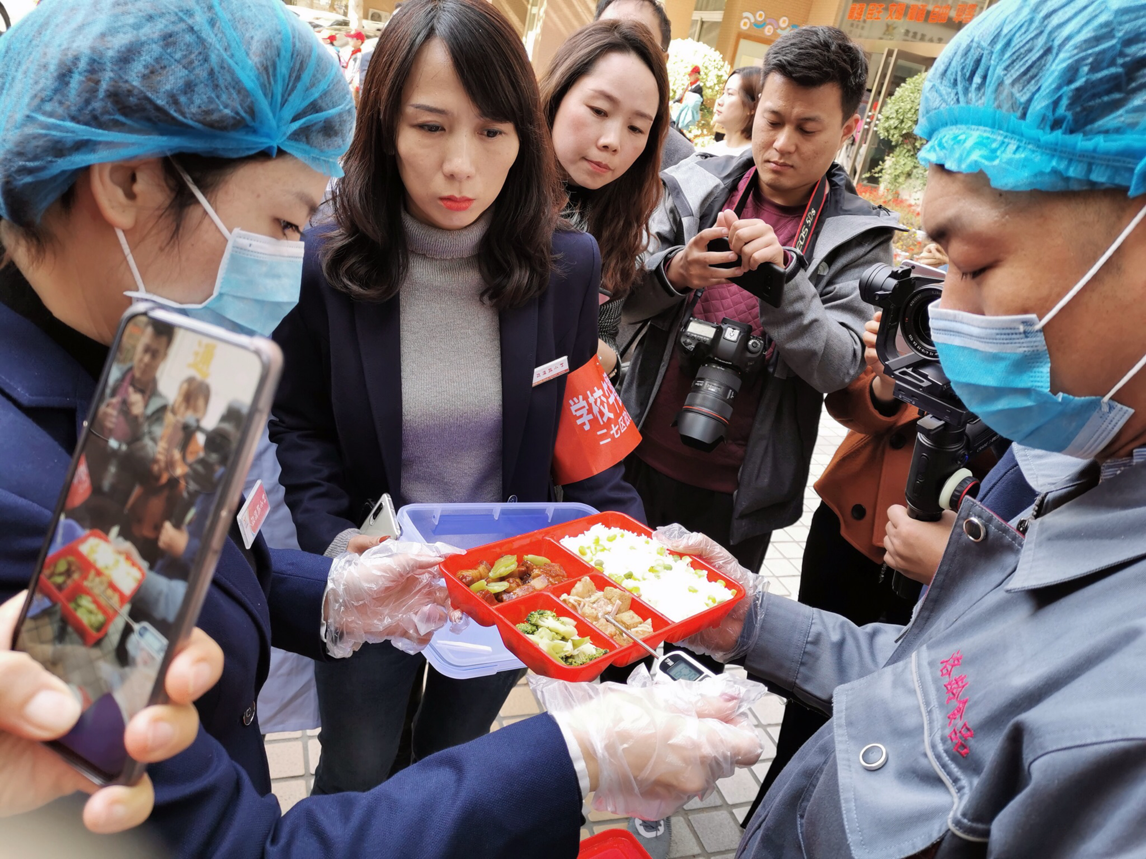 每次装餐的保温箱开启时,要由二七区市场监督管理局专业人员进行检验、测量、留样,确保午餐品质和就餐温度,之后,由工作人员送上学生的餐桌。