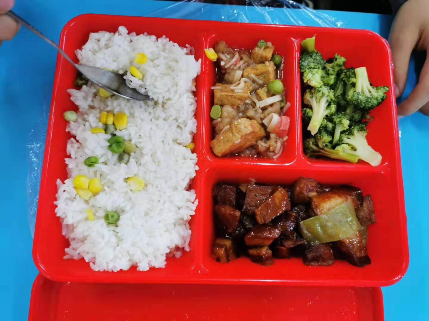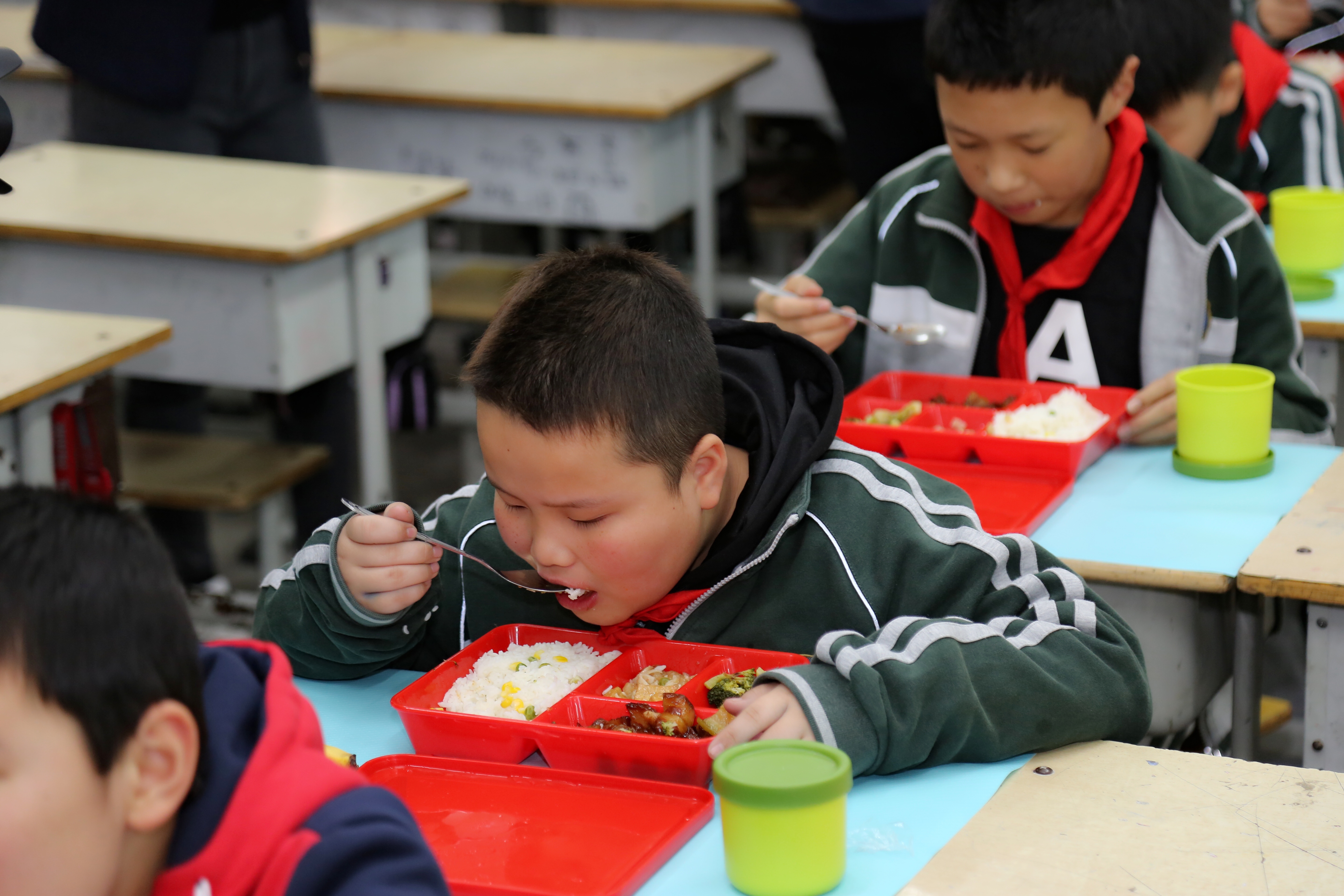 中午12时,记者来到政通路小学四年级三班。此时,学生们正在吃午餐。红色的配餐盒里,盛有米饭、红烧肉、西兰花和烧豆腐,另外每位学生还配送了一份营养菌汤和一根香蕉。