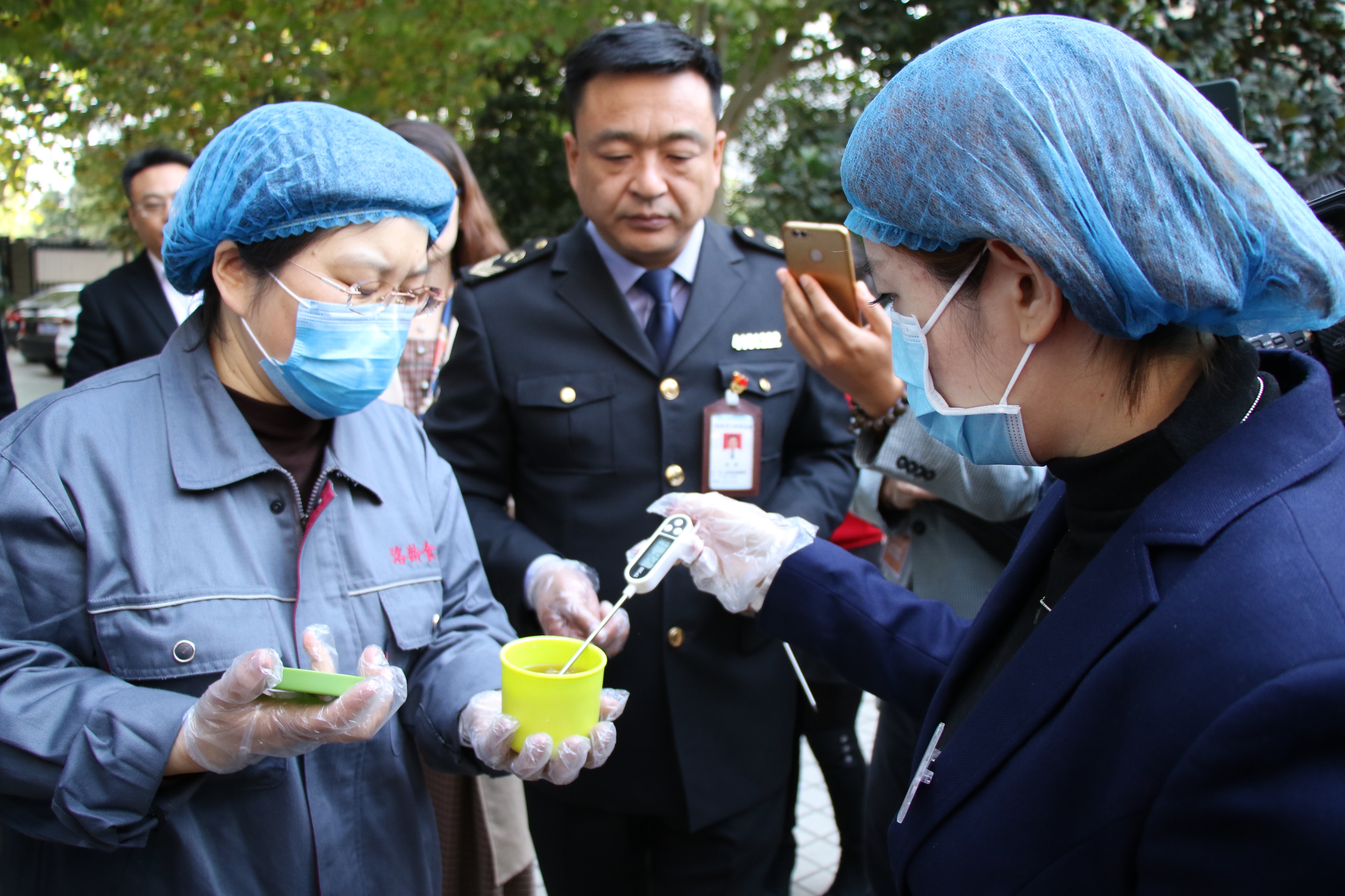 在学生们就餐前,来自二七区市场监督管理局的专业人员首先对当天送的配餐进行了食品安全抽样检测和留样,在确定各项指标达标后,才让送餐工作人员把饭菜端到孩子们面前。