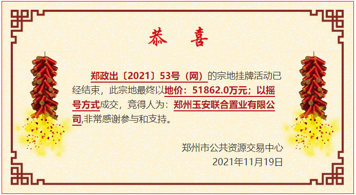【大河报·大河财立方】11月19日,大河报·大河财立方记者获悉,郑州二七区郑政出〔2021〕53号(网)地块被郑州玉安联合置业有限公司以起始价成交,成交价5.19亿元,折合单位地价889.53万元/亩,楼面地价3812元/平方米,溢价率0%。郑州玉安联合置业有限公司为河南亚星置业集团全资子公司。(记者 裴熔熔 徐兵)