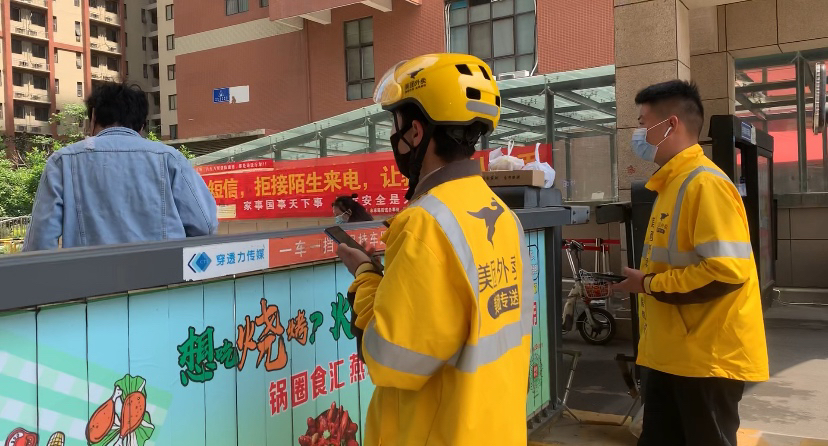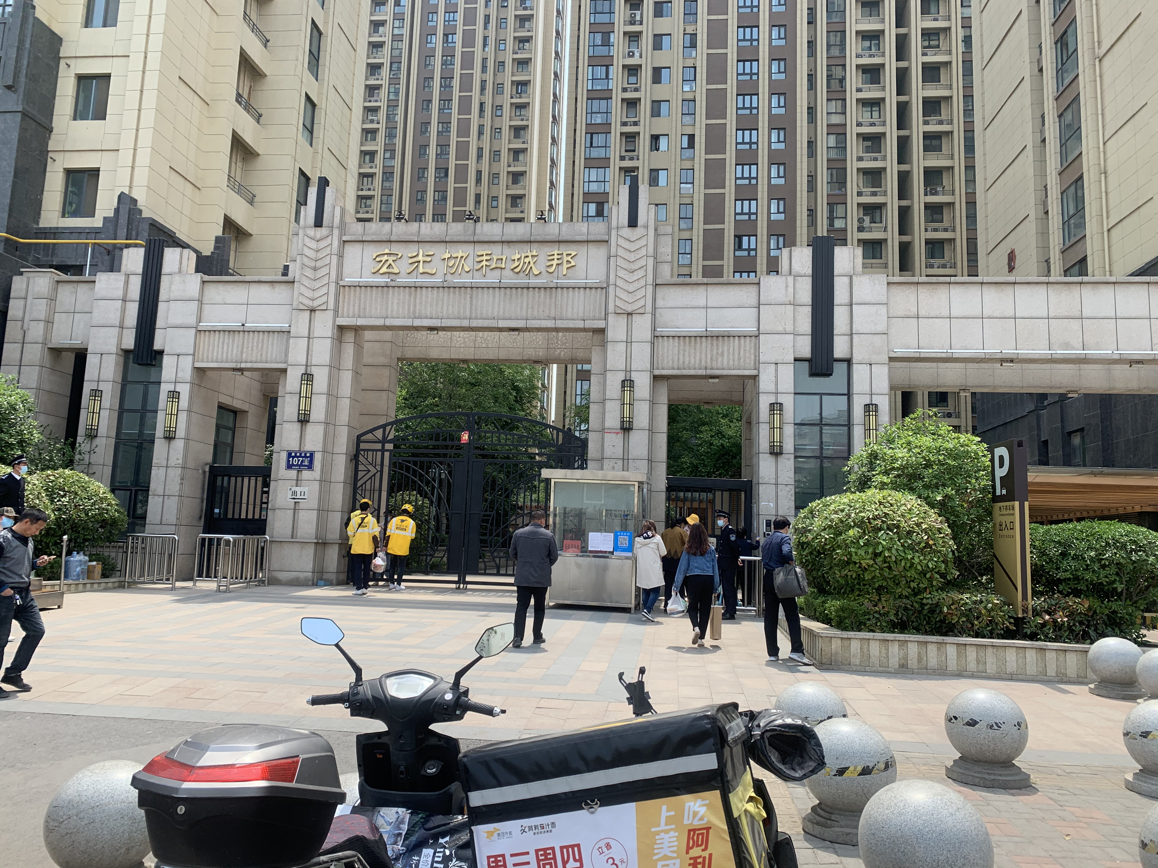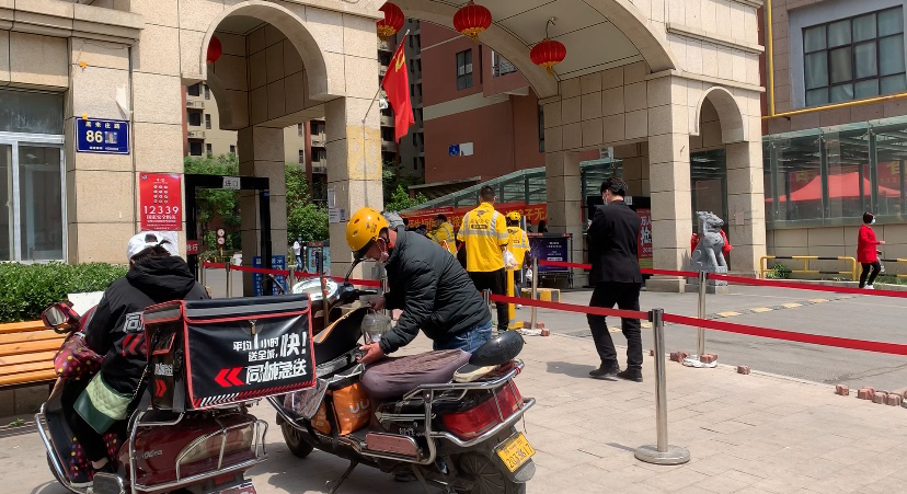 4月23日中午,郑州市金水区一小区门口,外卖小哥“扎堆儿”