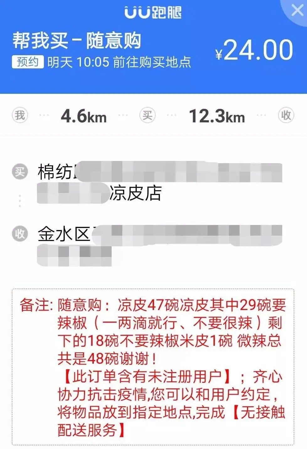 “目前,周围的饭店陆陆续续都复工了,火锅、奶茶、串串、烤鸭.....终于可以开吃了!可苦了我们跑腿小哥,各种代买订单都来啦。”22日,UU跑腿官方发布了最近一段时间跑腿小哥接到的各种“人间真实”订单,除了常见的小龙虾、胡辣汤等,还包括一宗凉皮订单。值得注意的是,这笔订单包括47碗凉皮和1碗米皮。“47碗凉皮,其中29碗要辣椒(一两滴就行,不用很辣),18碗不要辣椒,还有一碗要米皮,微辣!”