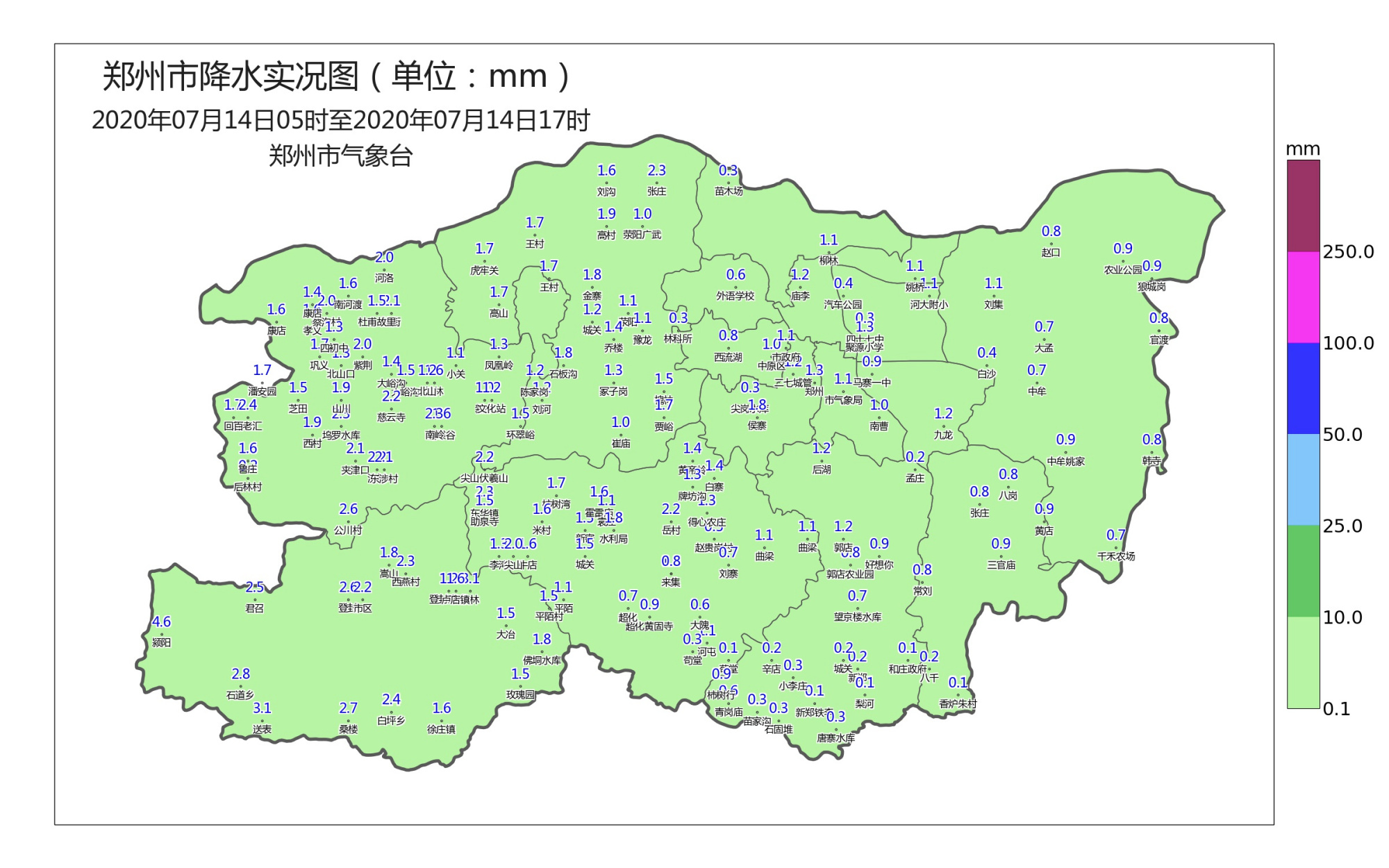 根据郑州市气象台统计,7月14日5时至7月14日17时,郑州市出现小雨。雨量较大的站点有(毫米):郑州的侯寨1.8、郑州站1.3;中牟县的九龙1.2、刘集1.1;新郑市的后湖1.2、郭店1.2;新密市的尖山伏羲山2.2、岳村2.2;荥阳市的张庄2.3、高村1.9;登封市的颍阳4.6、少林3.1;巩义市的公川村2.6、百老汇2.4。