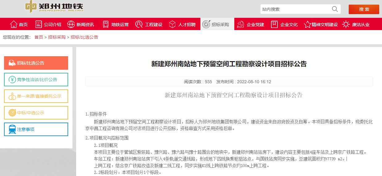 【大河财立方消息】8月12日,据郑州地铁集团消息,郑州地铁集团近日发布了新建郑州南站地下预留空间工程勘察设计项目招标公告,有望引入4条轨道交通线路。投标文件递交截止时间和投标截止时间为2022年9月2日10时00分。
