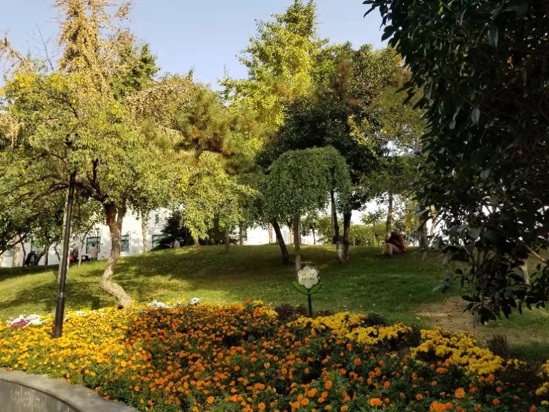 啾啾鸟语,凉爽秋风,月季花悄然绽放,花瓣层层叠叠,微微下卷,在阳光的照耀下光泽而明亮。橘黄色的多头康乃馨是平时不常见的品种,含苞待放,犹如羞涩的姑娘。游园的亭子里,不时传来阵阵歌声。
