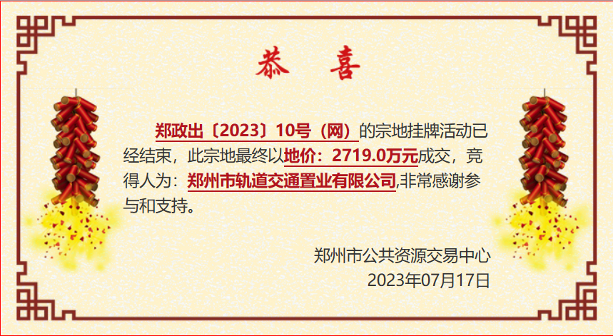 【大河财立方消息】 7月17日,据郑州市公共资源交易中心网站,郑州市轨道交通置业有限公司以2719.0万元的价格成功竞得郑政出〔2023〕10号(网)地块的国有建设用地地下空间使用权。