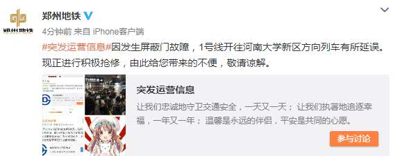 1月17日,记者从郑州地铁集团运营分公司获悉,因发生屏蔽门故障,郑州地铁1号线开往河南大学新区方向列车有所延误。现正进行积极抢修,由此给您带来的不便,敬请谅解。