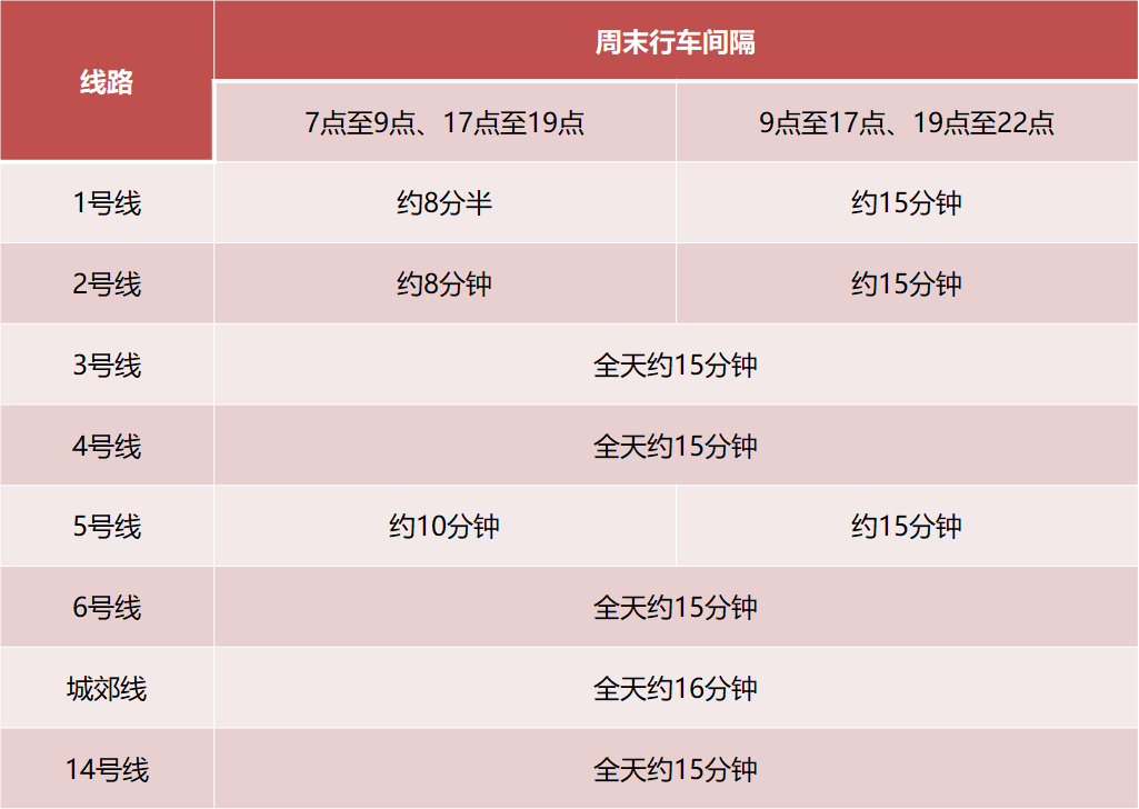 地铁线网周末行车间隔如下表: