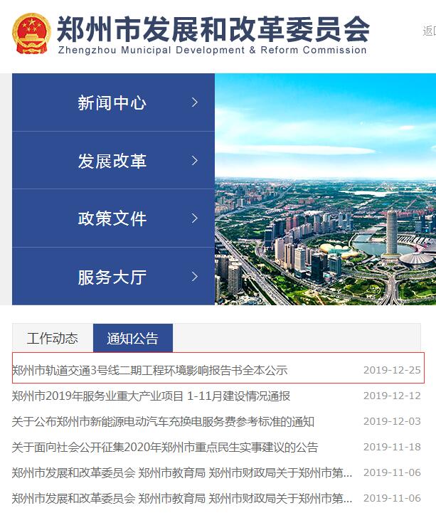 2019年12月25日,郑州市发改委官网发布《郑州市轨道交通3号线二期工程环境影响报告书全本公示》,文件提及郑州地铁3号线一期通车时间、3号线二期站点设置、通车时间、列车运营时间等内容。