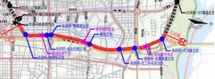根据规划,东四环沿途经过郑州市金水区、郑东新区、经开区,设置为“主线地面快速路(双向十车道)+辅路”形式。也就是说,东四环全线以地面道路为主,配备有2公里左右的高架桥,沿线由多处桥梁和道路相结合。