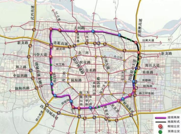 路线由南向北依次与陇海路、渠南路、中原路、郑上路、化工路、科学大道、连霍高速(新龙路)、大河路等主要道路相交,设置7座互通立交,其中新建立交5座(中原路(渠南路)立交、郑上路立交、化工路立交、科学大道立交、大河路立交),改造现状立交1座(连霍高速(新龙路)立交),利用现状立交1座(陇海路立交);另设上下匝道出入口11对,地面出入口3对,地面平交路口40处。