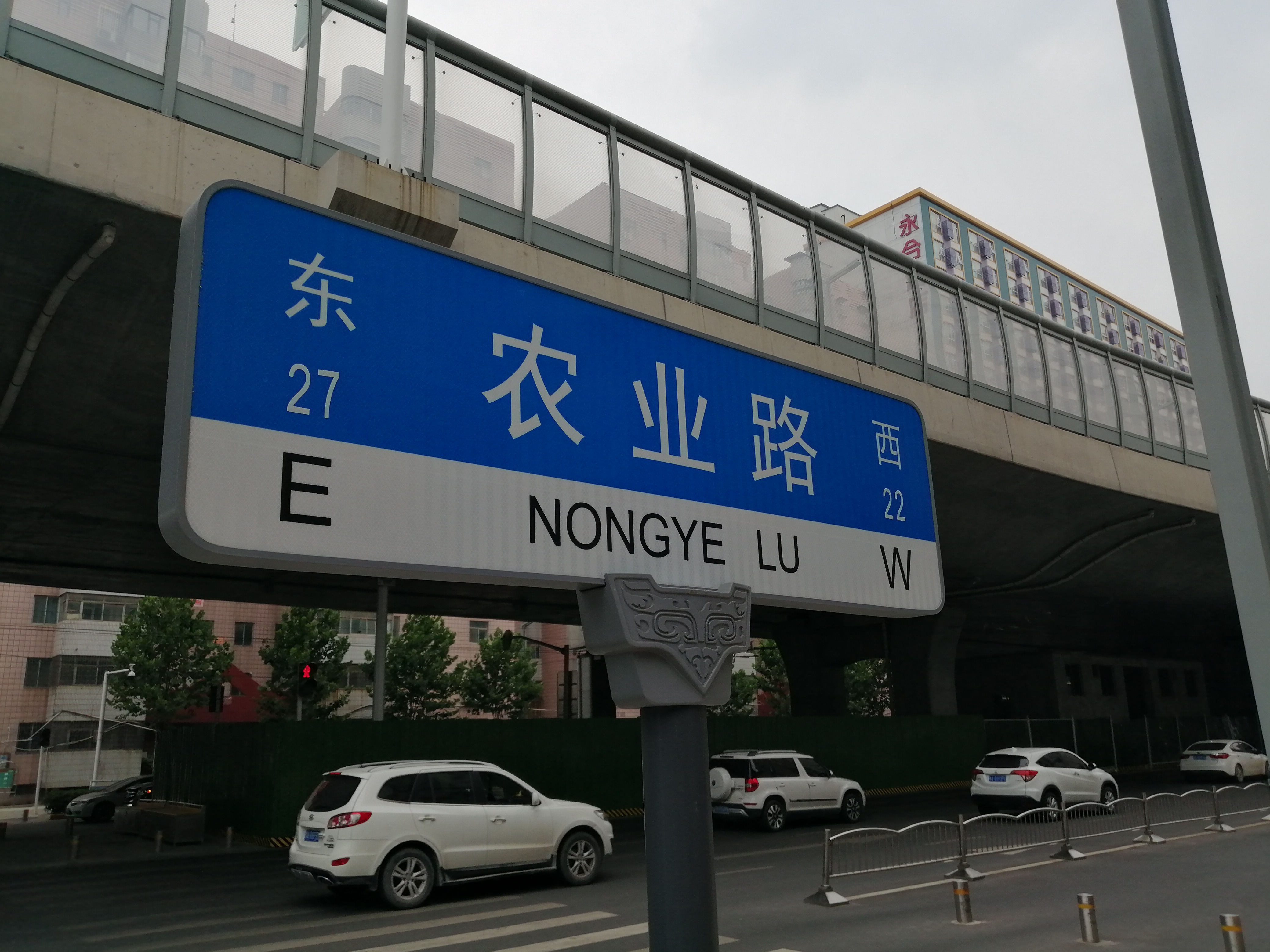 以农业路经二路交叉口的路名牌为例,路北为河南日报报业集团,门牌号为农业路东28号,所以从经一路到经二路这段农业路北侧的路名牌上便是两个“28”的字样。而农业路经三路交叉口西北角的路名牌上,数字则是“22”、“27”,这代表经二路至经三路这一段农业路北侧的单位门牌号为22到27。
