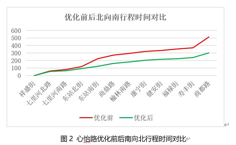 心怡路从金水东路至商都路段设置双向绿波带后,北向南行程时间由8分33秒缩短至5分02秒,行程时间下降了41.1%。停车次数由优化前平均4次减少至2次。南向北行程时间由11分35秒缩短至4分42秒,行程时间下降了59.4%。停车次数由优化前平均6次减少至2次。与优化前对比,驾驶体验感有较大提升。
