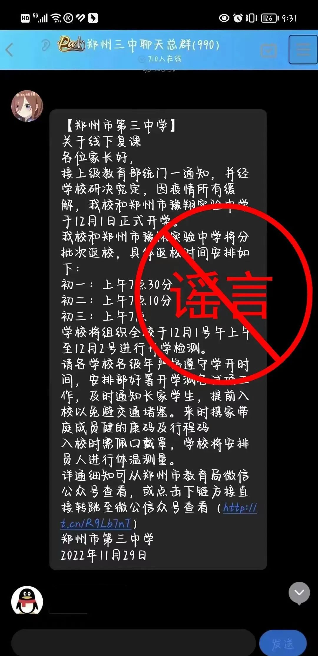 辟谣!“郑州市管城区外国语中学等学校恢复线下教学”是假消息