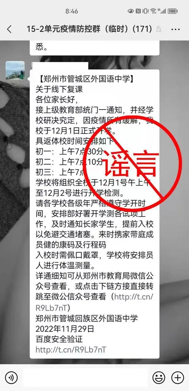 11月29日,“郑州市管城回族区外国语中学关于恢复线下教育教学的通知”、“郑州市第三中学关于恢复线下教育教学的通知”在微信群、朋友圈疯传,此信息是假消息。