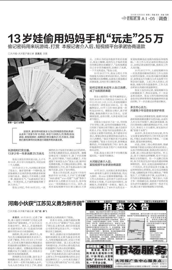 连日来,家住郑州的张女士为讨回钱款在四处奔波:从去年7月至今年10月初,年仅13岁的儿子(伟伟)在玩游戏、刷短视频时,消费和打赏主播共计25万余元。(大河报10月29日AI·05版报道)