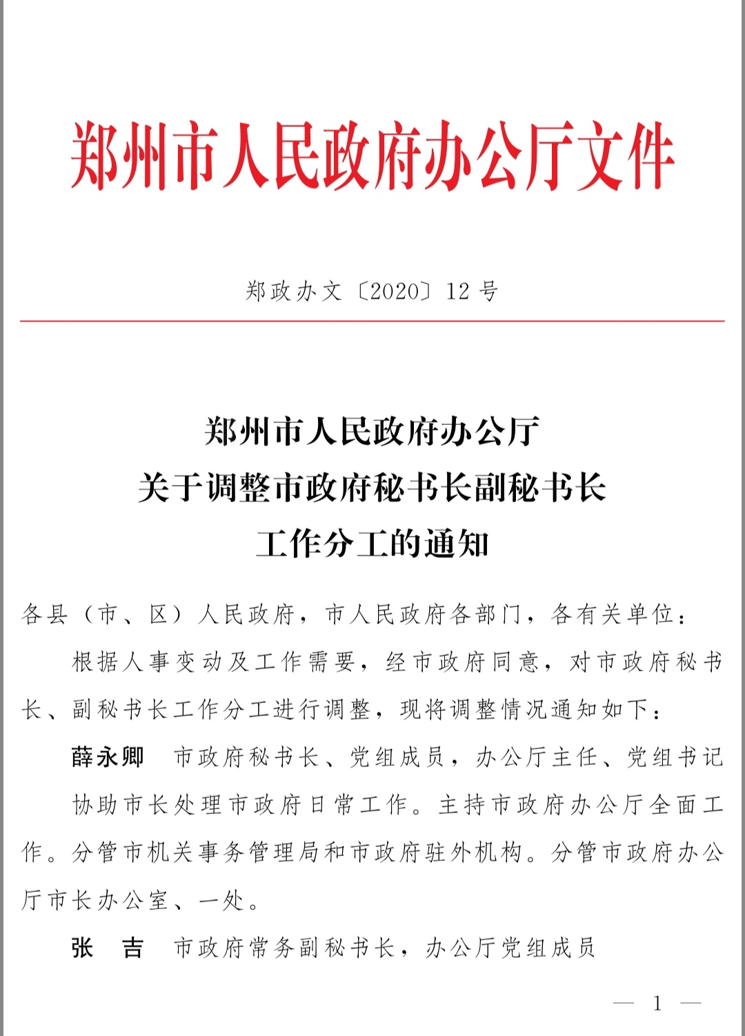 郑州市政府秘书长副秘书长工作分工有调整。郑州市人民政府办公厅发布《关于调整市政府秘书长副秘书长工作分工的通知》(以下简称《通知》),根据人事变动及工作需要,经市政府同意,对市政府秘书长、副秘书长工作分工进行调整。调整情况通知如下: