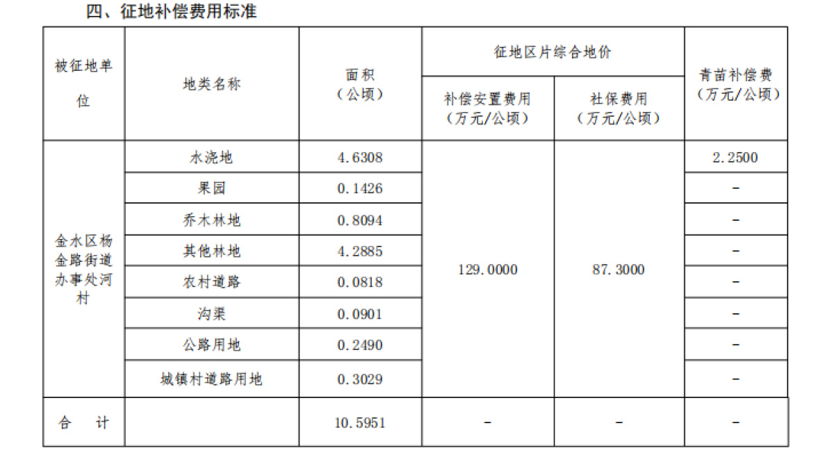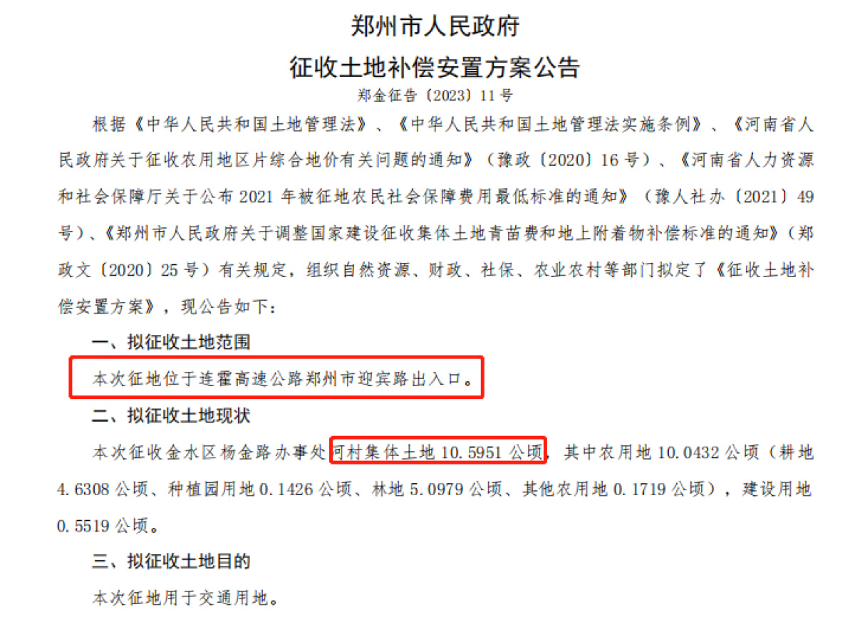 近日,一则《郑州人民政府征收土地补偿安置方案公告》引起了很多市民的关注,公告中显示,本次征地位于连霍高速公路郑州市迎宾路出入口,本次征收金水区杨金路办事处河村集体土地10.5951公顷,其中农用地10.0432公顷,建设用地0.5519公顷,共计补偿2302.1394万元。