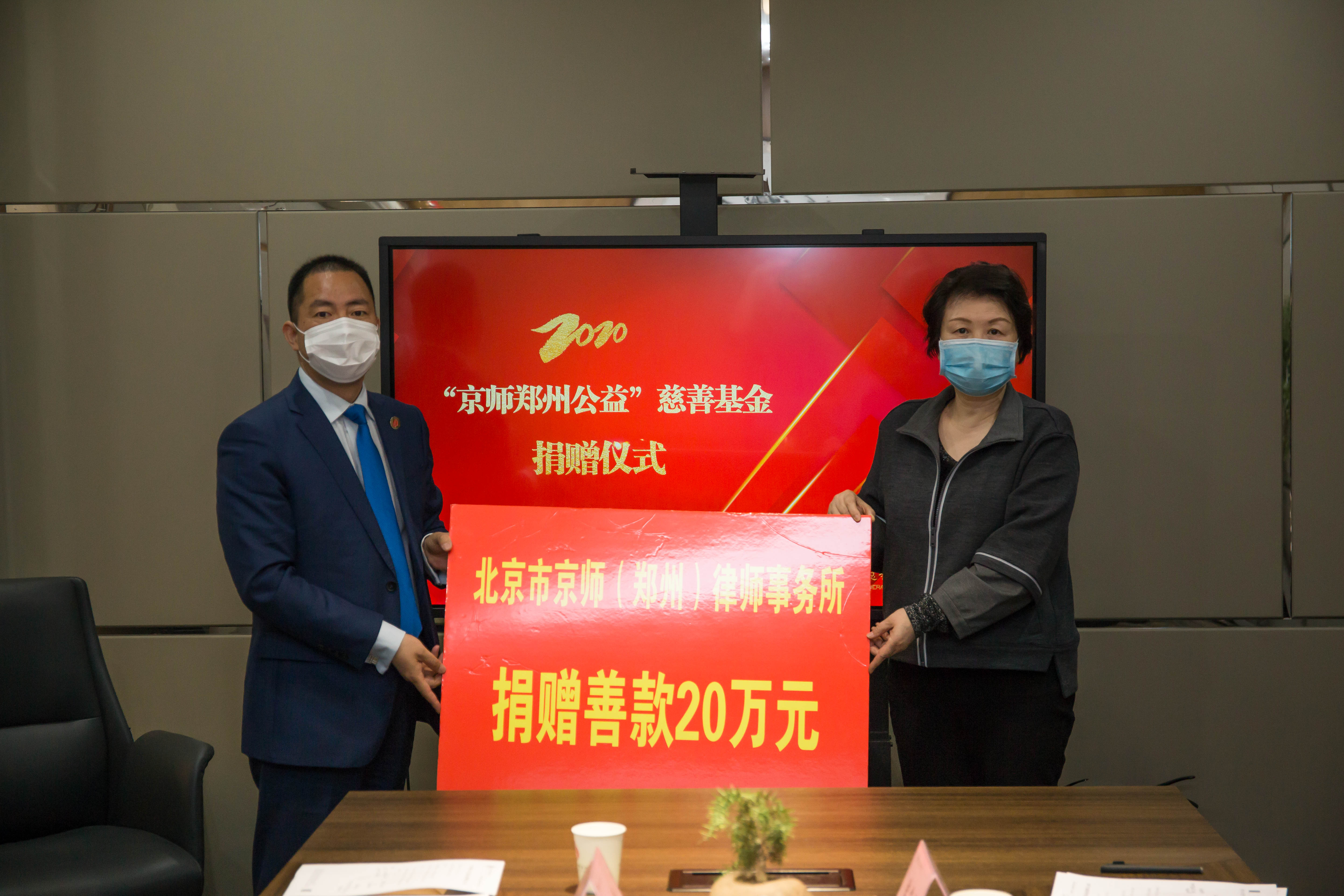 4月20日上午,“京师郑州公益”慈善基金捐赠仪式在北京市京师(郑州)律师事务所举行,