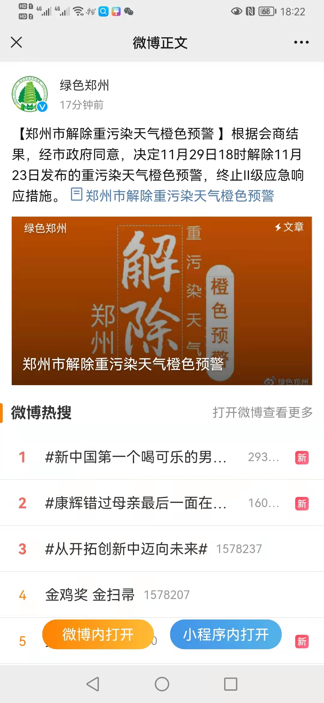 郑州市29日18时解除重污染天气橙色预警