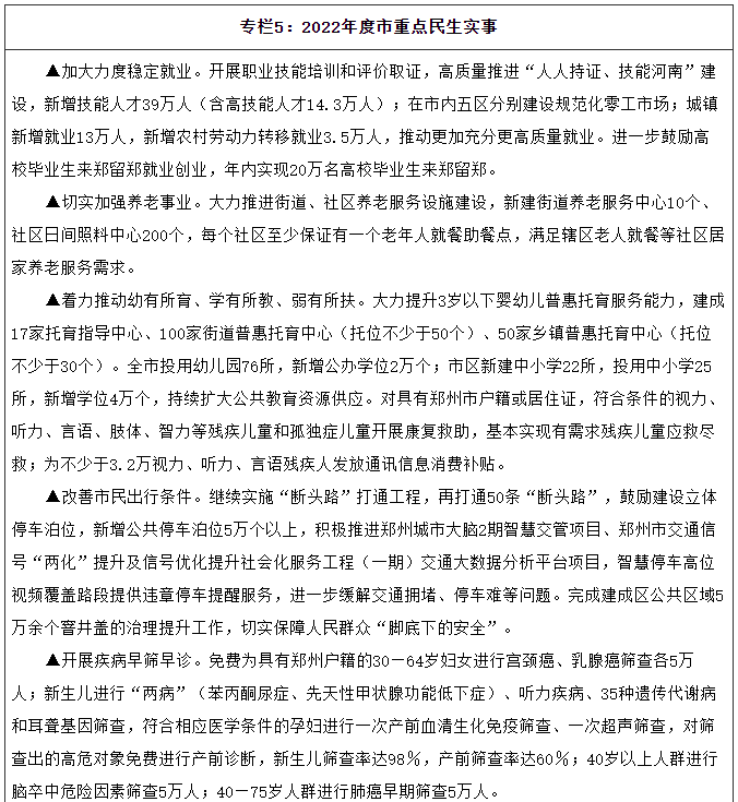 五是持续强化社会保障。兜住兜牢民生底线,积极做好社会保险扩面参保工作,完善多层次医疗保障体系。加快建设综合性医保热线平台,深化“互联网+医保服务”,推动郑开两地医保业务“一网通办”。不断完善社会救助体系。逐步完善住房保障体系,新开工棚户区改造4257套、基本建成3.2万套,保障性租赁住房筹集5万套,快速推进住房租赁市场发展。