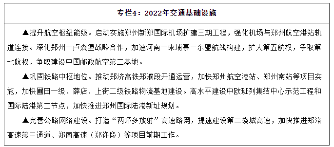 二是持续畅通开放通道。全面畅通“空中丝绸之路”双枢纽、双循环联络通道,力争2022年郑州机场客运量完成2400万人次、货运量75万吨。逐步完善“陆上丝绸之路”一枢纽、四通道战略布局,积极拓展新线路,力争2022年中欧班列(中豫号)开行班次增长30%。着力优化“网上丝绸之路”两体系、多元化发展路径,完善跨境电商供应链体系,启动跨境电商智慧化服务体系建设,加快推进综保区贸易多元化发展,加快跨境电商零售进口药品试点业务发展,鼓励跨境电商货运包机常态化运营,支持建设一批海外仓,办好第六届全球跨境电商大会,2022年跨境电商交易规模同比增长5%。不断加强“海上丝绸之路”多通道、集疏运能力提升,推进贾鲁河航运开发,加大重点港口合作力度,发展壮大铁海联运市场主体,力争2022年铁海联运达到2万标箱。