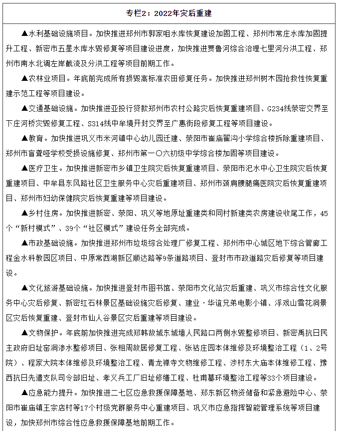 一是大力推进灾后重建。加快推进城乡居民房屋恢复重建任务,确保6月底前所有集中安置项目主体完工,年底前群众搬迁入住,有序落实老旧危房和直管公房改造整治。加大灾毁交通基础设施重建,6月底前完成较大、重大灾毁路段恢复重建,10月底前完成特别重大灾毁路段恢复重建。力争水毁水利项目2022年汛期前全部完工,未完工的要切实做好安全度汛。进一步完善防洪规划体系、防洪工程体系,加快《郑州市防洪规划》等规划编制工作,实施全市143座中小型水库“一库一案”整治工程,积极实施贾鲁河、金水河、汜水河等一批河道综合治理项目,稳步推进郑州市南水北调左岸截流及分洪工程等防洪工程建设,全面提升水利工程设施防洪减灾能力。加快建设海绵城市,优化完善城市排水设施功能,加快城区易涝道路治理,完成150公里排水管网疏挖,对泵站设施进行改造提升;开展198处积水点整治工作;补齐防灾减灾救灾短板,进一步完善《郑州市防汛应急预案》,注重“避险工程”建设,围绕特大城市发展安全,提高各类城市基础设施安全标准,建立供水、供电、能源、交通、地下空间等安全防控体系。