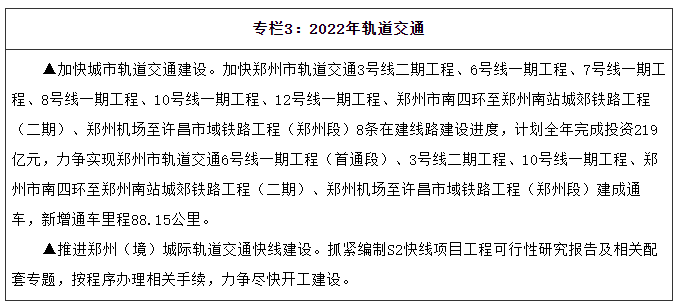 ➤加快城市轨道交通建设。加快郑州市轨道交通3号线二期工程、6号线一期工程、7号线一期工程、8号线一期工程、10号线一期工程、12号线一期工程、郑州市南四环至郑州南站城郊铁路工程(二期)、郑州机场至许昌市域铁路工程(郑州段)8条在建线路建设进度,计划全年完成投资219亿元,力争实现郑州市轨道交通6号线一期工程(首通段)、3号线二期工程、10号线一期工程、郑州市南四环至郑州南站城郊铁路工程(二期)、郑州机场至许昌市域铁路工程(郑州段)建成通车,新增通车里程88.15公里。