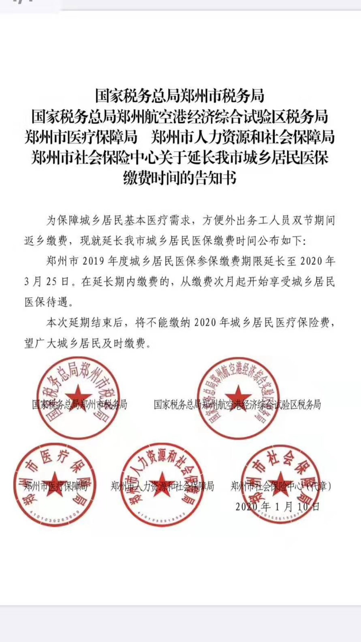 据记者了解,10日,国家税务总局郑州市税务局、国家税务总局郑州航空港经济综合试验区税务局、郑州市医疗保障局、郑州市人力资源和社会保障局、郑州市社会保险中心就延长郑州市城乡居民医保缴费时间联合下发告知书。