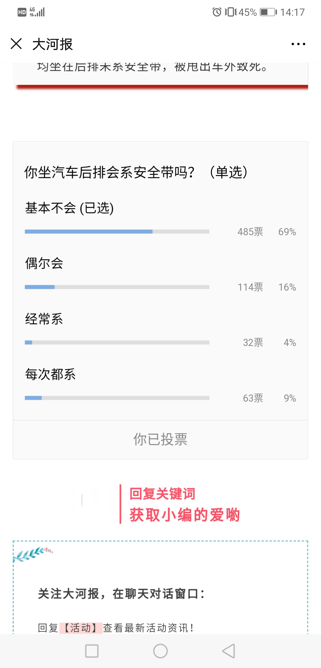 12月5日,大河报官方微信在网上做了一项关于“坐在汽车后排是否会系安全带”的调查,其中,一共694人参与,485人选择坐后排“基本不会系安全带”,114人选择“偶尔会系”,32人选择“经常会系”,63人选择“每次都会系”。而选择坐在后排不会系安全带的人数占69%。而这一数据与浙江高速交警部门做的一项数据调查结果一致。