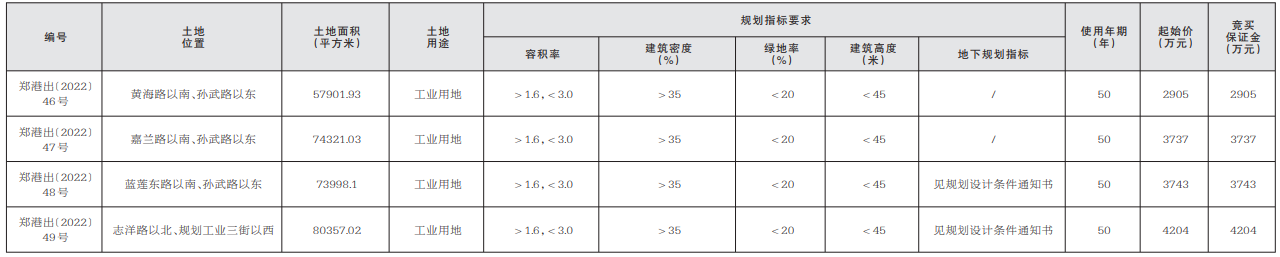 新郑市自然资源和规划局、郑州市自然资源和规划局郑州航空港经济综合实验区分局决定以挂牌方式出让郑港出〔2022〕46 号等 4宗国有建设用地使用权。4宗地块均为产业用地,项目建设需符合产业要求。