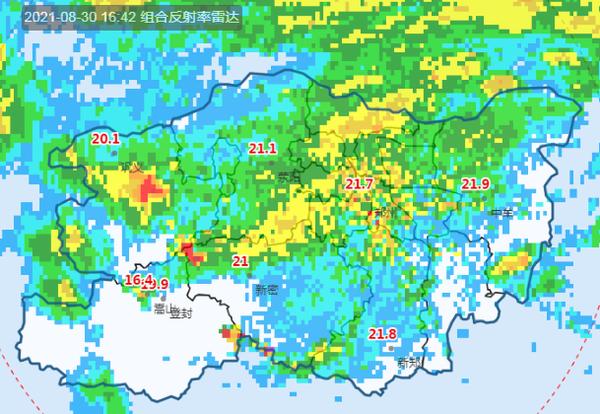 8月30日16时42分郑州市气象台发布雷达回波图显示,目前巩义、荥阳、郑州市区、中牟有降水回波。