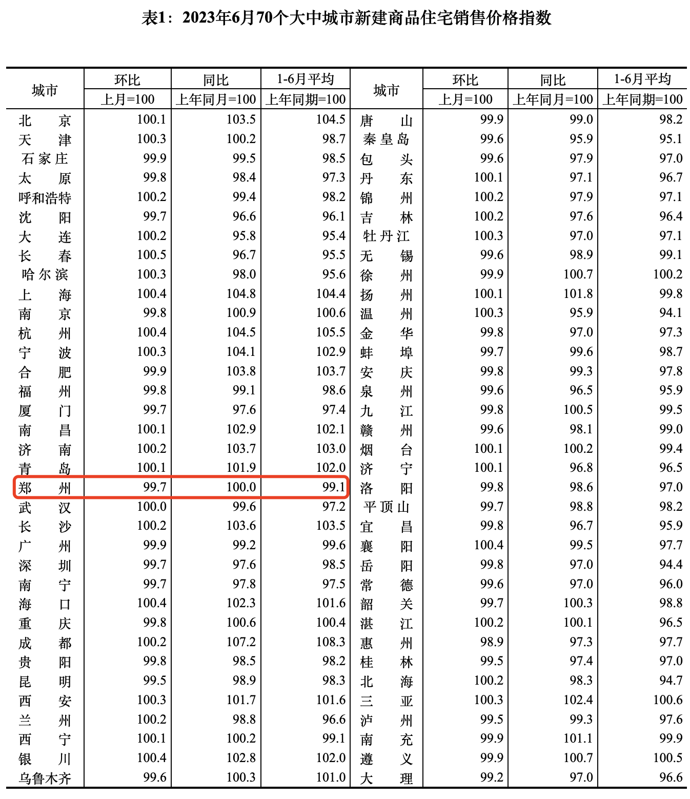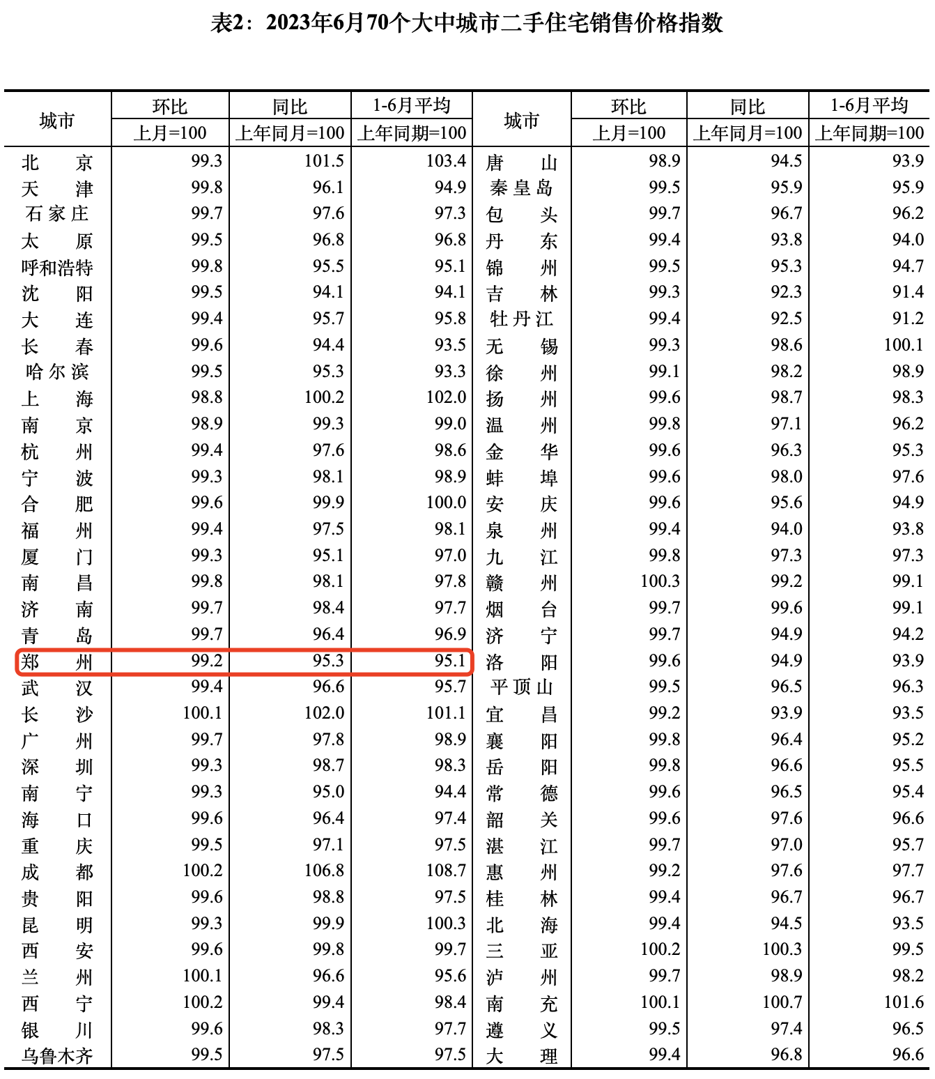 【大河财立方 记者 朱娟】7月15日,国家统计局发布6月份70个大中城市商品住宅销售价格变动情况。其中,6月郑州新房价格环比下跌0.3%,继5月小幅下跌后继续下跌,跌幅较5月扩大0.1个百分点;同比由5月上涨0.1%转为持平。二手房价格环比下跌0.8%,跌幅较5月扩大0.4个百分点;同比下跌4.7%,跌幅较4月扩大0.1个百分点。