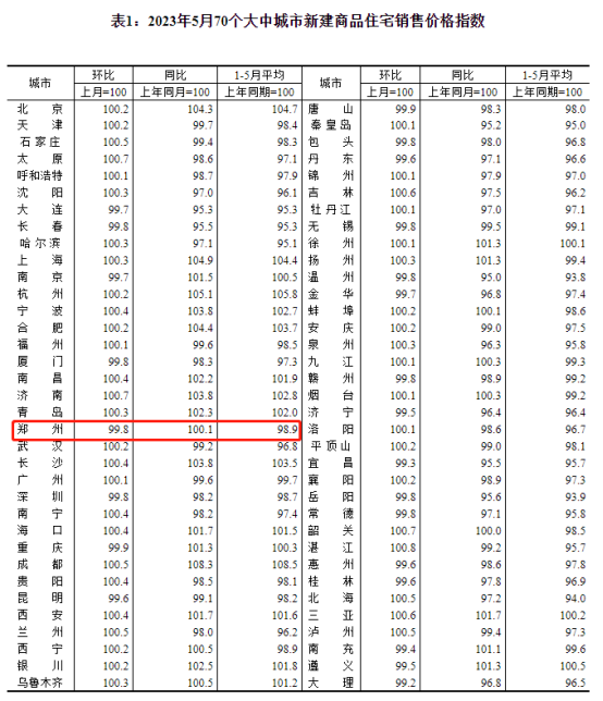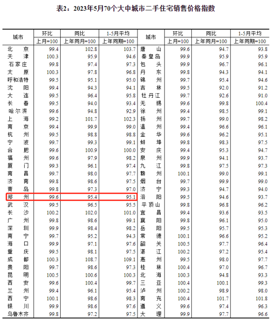 【大河财立方 记者 朱娟】6月15日,国家统计局发布5月份70个大中城市商品住宅销售价格变动情况。其中,5月郑州新房价格环比下跌0.2%,在连涨4个月后小幅下跌,同比上涨0.1%,涨幅较4月收窄0.1个百分点;二手房价格环比下跌0.4%,跌幅较4月扩大0.1个百分点,同比下跌4.6%,跌幅较4月扩大0.2个百分点。