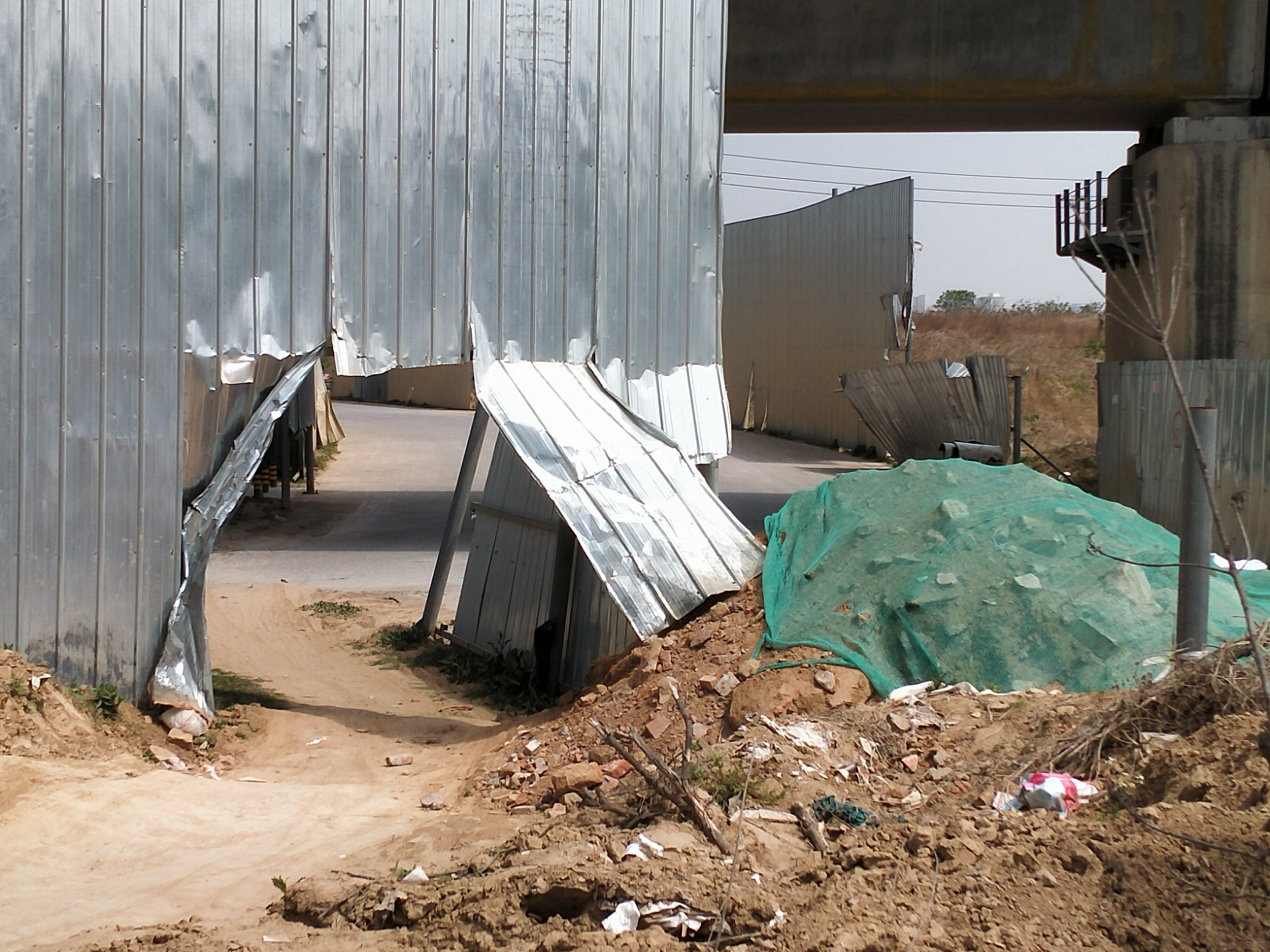 顺着陇海西路往西行走几十米远,东北方向有一个蜿蜒的土路,穿过围挡下方的“大洞”后,可到达新田大道向中原西路方向行驶。