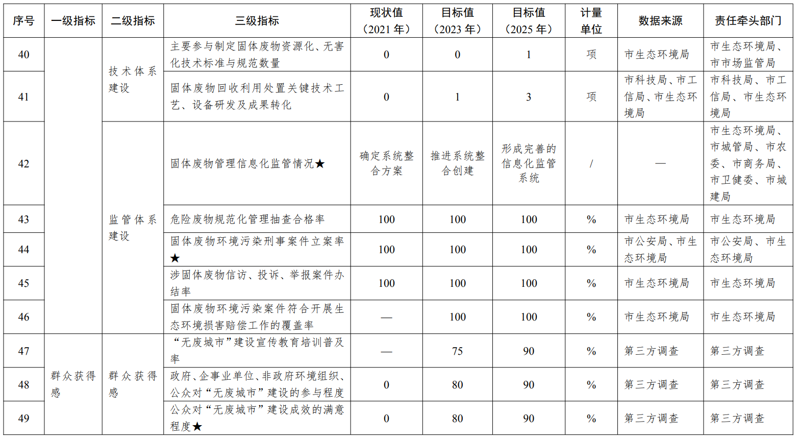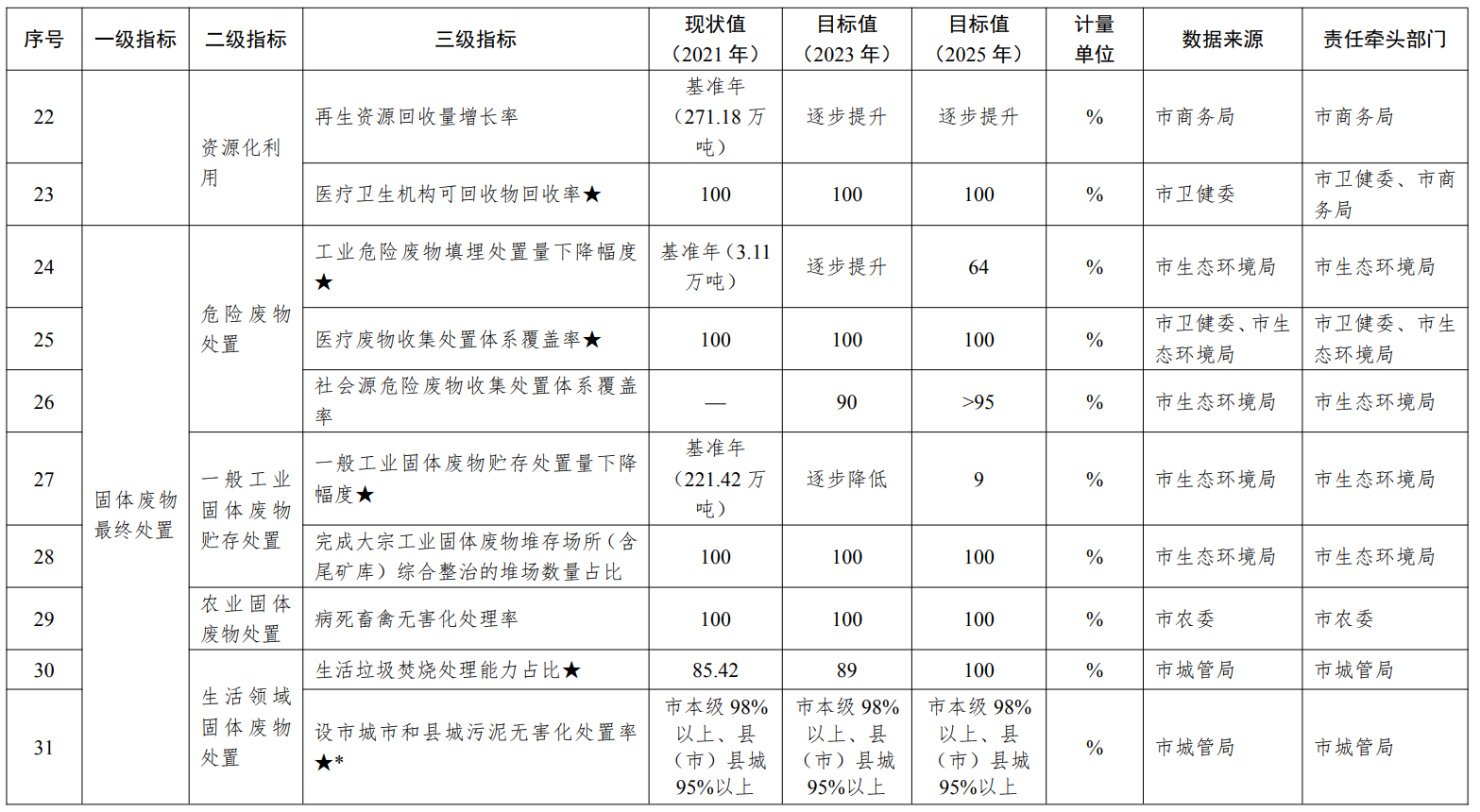 工业领域(2项):规模以上工业单位增加值能耗下降高于国家要求4.5个百分点,达到18%;一般工业固体废物综合利用率高于国家平均水平10个百分点,达到85%。生活领域(2项):深化生活垃圾分类工作,实现城乡生活垃圾分类基本全覆盖;生活垃圾回收利用率高于国家要求5个百分点,达到40%。建筑领域(1项):装配式建筑占新建建筑的比例高于国家要求10个百分点,达到40%。农业领域(3项):秸秆综合利用率高于国家要求9个百分点,达到95%以上;农膜回收率高于国家要求12个百分点,达到97%以上;规模以上畜禽养殖场畜禽粪污综合利用率高于国家要求15个百分点,达到95%。