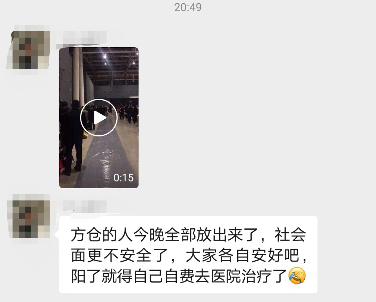 12月4日,郑州市发布《关于优化调整新冠肺炎疫情社会防控措施的通告》规定,郑州市民出入小区,乘坐公交、地铁、出租车(网约车)等市内公共交通工具,进入其他公共场所等不再查验核酸检测阴性证明。不少市民看到郑州疫情防控的最新政策,认为该视频也是新政策的一部分,并在抖音、微信群等平台转发、评论。其中,不少业主看到该视频,恐慌地说:“方舱的人今晚全部放出来了,社会面更不安全了,大家各自安好吧,阳了就得自己自费去医院治疗了”。