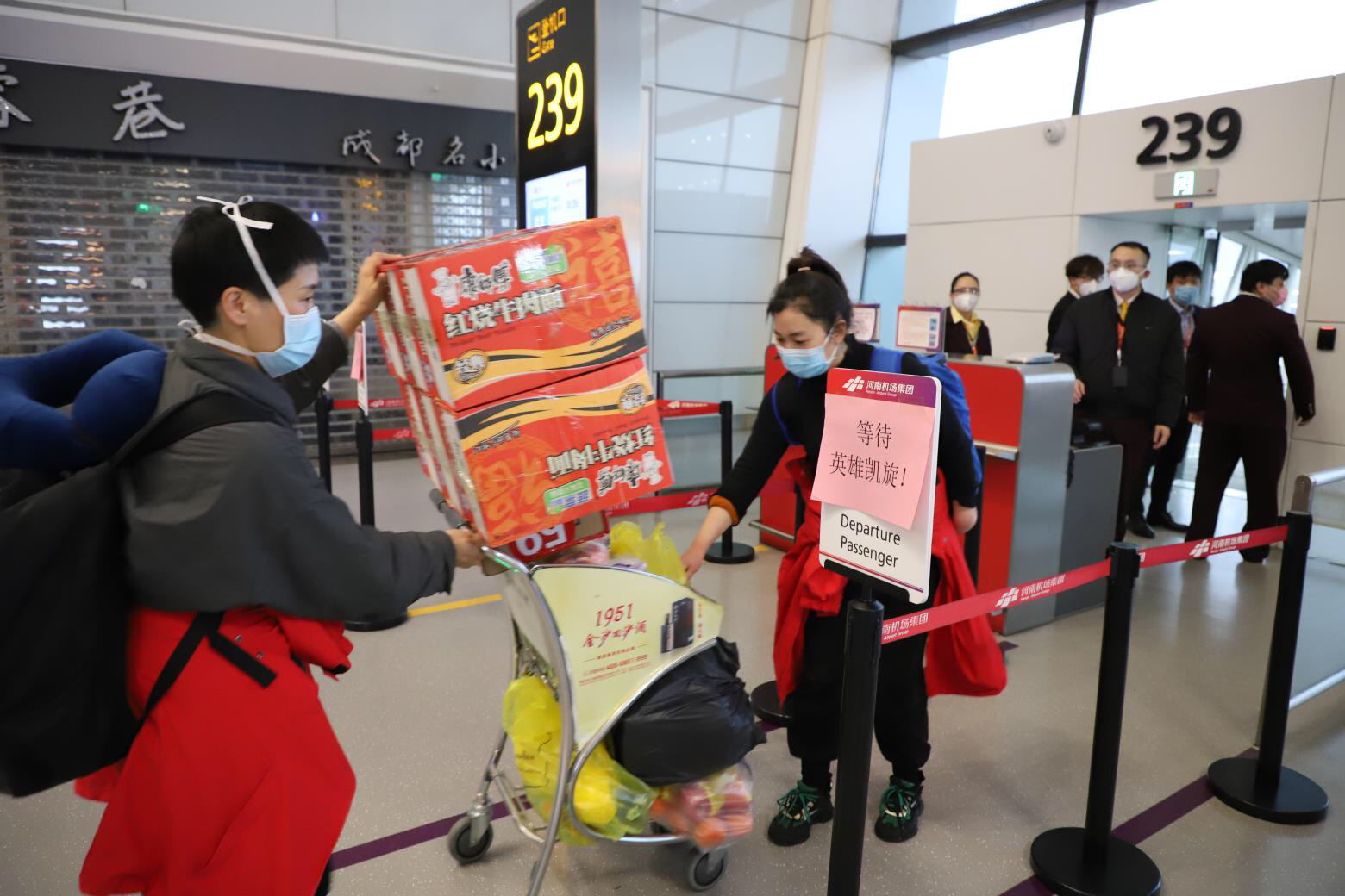 2月21日下午16时许,由174名医务人员组成的河南省支援湖北医疗队乘坐大巴首先赶到郑州机场,这些白衣天使都带有不少行李和救护物资,一进入出发大厅,郑州机场和西部航空郑州公司的工作人员就开始忙活起来,帮助医务人员办理登机牌、托运行李等手续,为保障医护人员快速顺利登机,郑州机场各部门联动,在T2航站楼4楼5号门开通进入航站楼专用快速通道,确保医疗队快速进场。机场安检调配人员,为医疗队包机人员开通42、43专用安检通道,协调医疗队解决携带部分医疗物资快速过检等问题,确保防疫人员快速通过。过了安检之后,针对医务人员所带的部分物品和行李托运困难、需要带进机舱的问题,工作人员携助医务人员手提肩扛进机舱,登机后,西部航空机组人员积极协助医务人员在机舱内有序摆放大件行李,由于提前在飞机座舱内规划预留好了充足的位置,大件未托运的医疗物资得以顺利摆放到位。