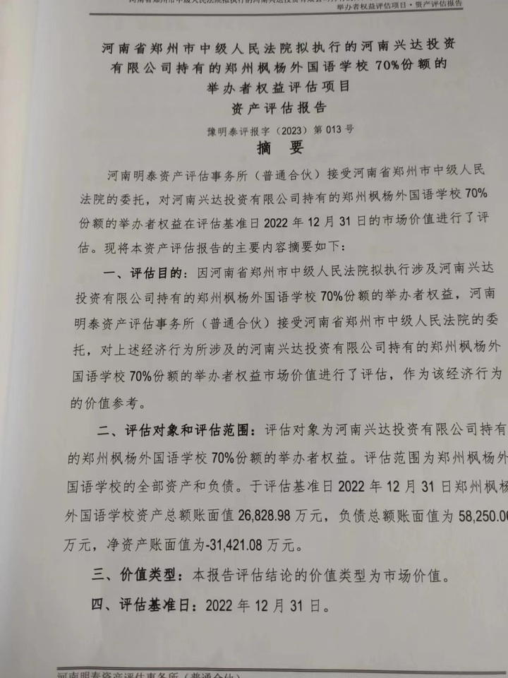 据悉,郑州枫杨外国语学校资产总额账面值2.68亿元,净资产账面值-3.14亿元。凡具备完全民事行为能力的自然人、法人和其他组织均可参加竞买。