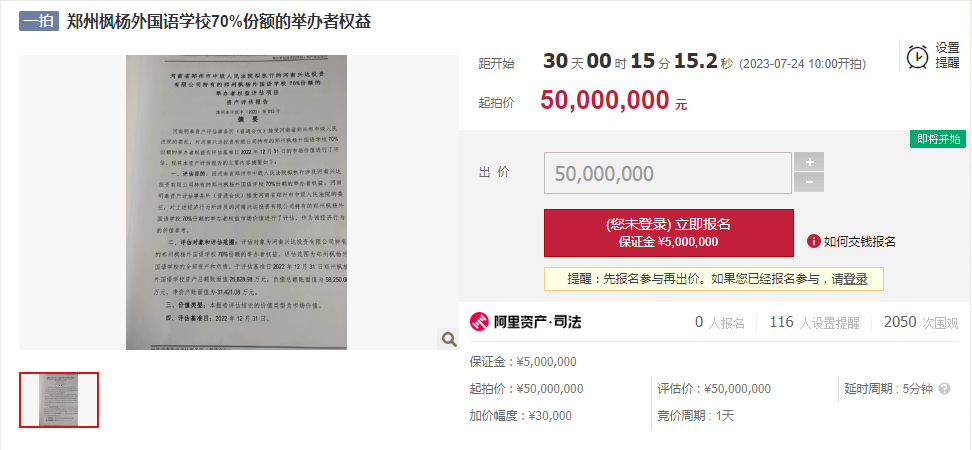【大河财立方消息】6月24日,大河财立方记者获悉,郑州枫杨外国语学校70%份额的举办者权益在司法拍卖平台挂牌,起拍价5000万元,2023年7月24日开拍。