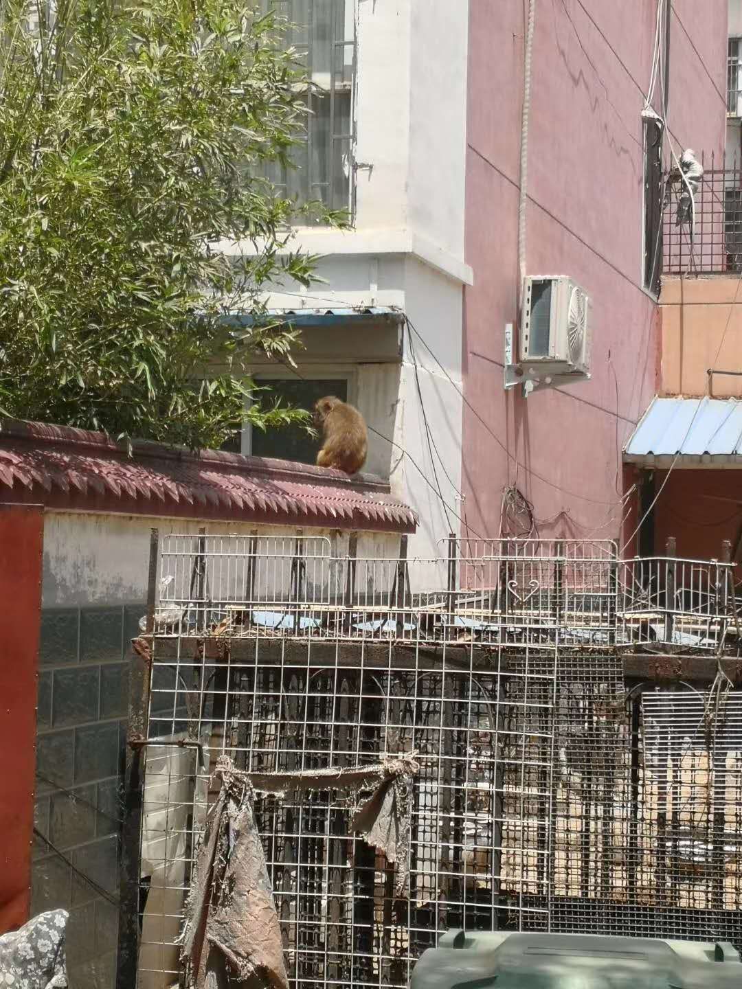 这只猕猴,出现在秦岭路一与沁河路交叉口附近一小区。几天前的一天夜晚,居民陈先生回家突然发现,他饲养的狗狗旁边,多处了一个貌似同类。凑近观察,让他吓了一大跳。它那是狗狗的同类,原来是只猴子。猴子见人,跃身离去,攀爬到院子一棵椿树。不速之客光临,打破了小区的宁静生活。