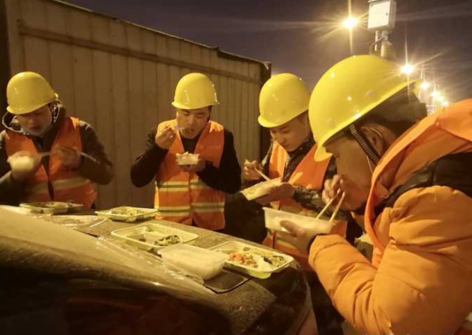 “抗疫”战场上,他们将纸箱、工具箱当作“移动餐桌”,席地而坐,迅速扒两口饭又投入战斗……