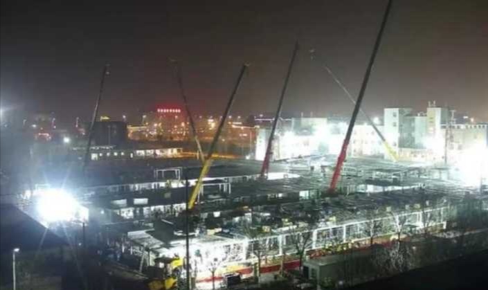郑州市城建局牵头、郑州市卫健委、航空港区配合,中建七局作为唯一一家EPC总包单位,负责设计、采购及施工组织,在原郑州市第一人民医院港区医院的原址及周围2.94万平方米的荒地上,日高峰期组织5000余人及200余台机械设备同时施工,10天建成包含病房住院、接诊观察、医技综合、生活保障等功能的肺炎患者定点救治医院。