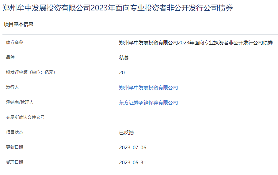 【大河财立方消息】7月6日,据上交所公司债券项目信息平台显示,郑州牟中发展投资有限公司2023年面向专业投资者非公开发行公司债券项目状态更新为“已反馈”。