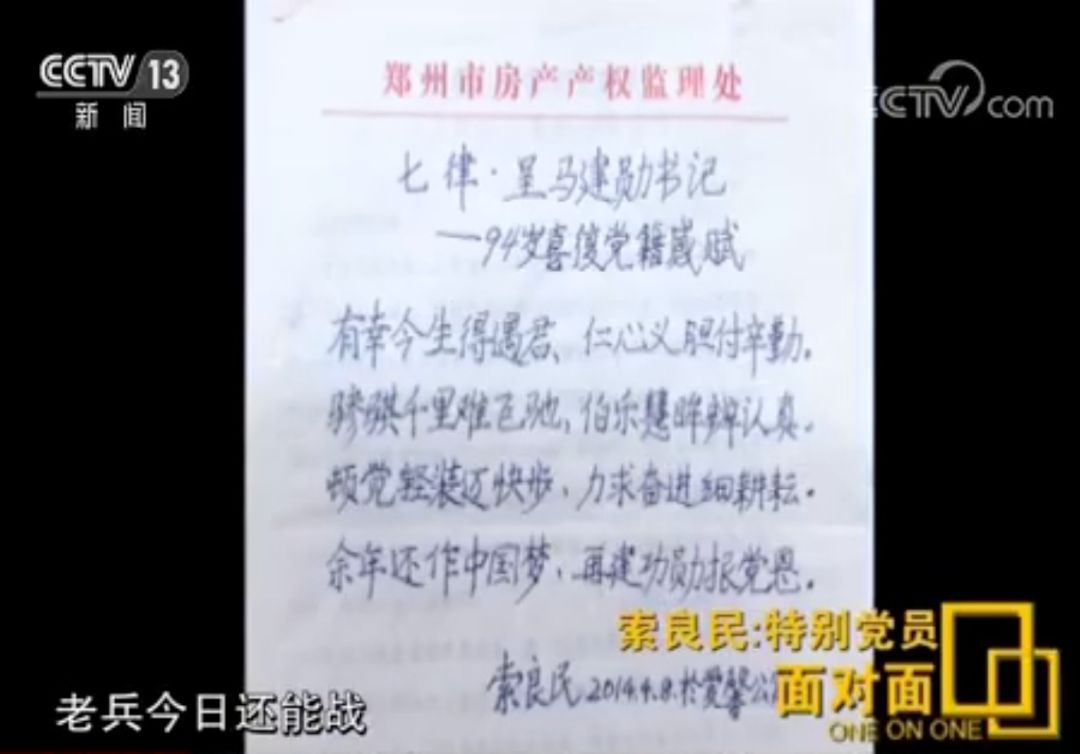 经过一年的努力,马建勋把搜集来的这些证据,递交给了上级党组织。2014年4月,马建勋拿到了上级党组织的批复,终于帮助索良民实现了66年的愿望。66年了,收到批复的那一天,索良民连夜写了一首诗,表达谢意。