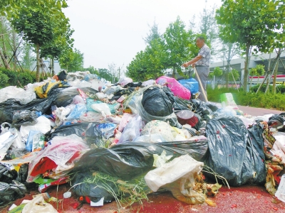 “这么热的天,如果不及时把垃圾清走,压在下面的大片麦冬很快就会被捂死。”绿化工郑师傅一边说,一边和其他绿化工将堆在绿化带内的生活垃圾往旁边的自行车道上铲。