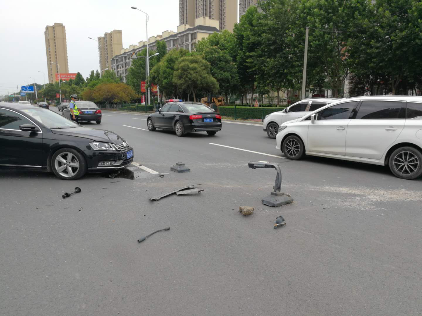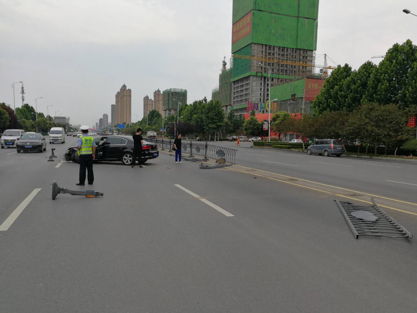 6月24日下午3时30分左右,在中牟县商都路与富顺街交叉口附近发生一起单方交通事故,肇事的轿车连续撞断了马路中间的6空隔离护栏后,冲到马路对面车道上才停了下来,被其撞飞的护栏散落在几十米以外,导致车辆损毁严重,所幸没有人员伤亡。